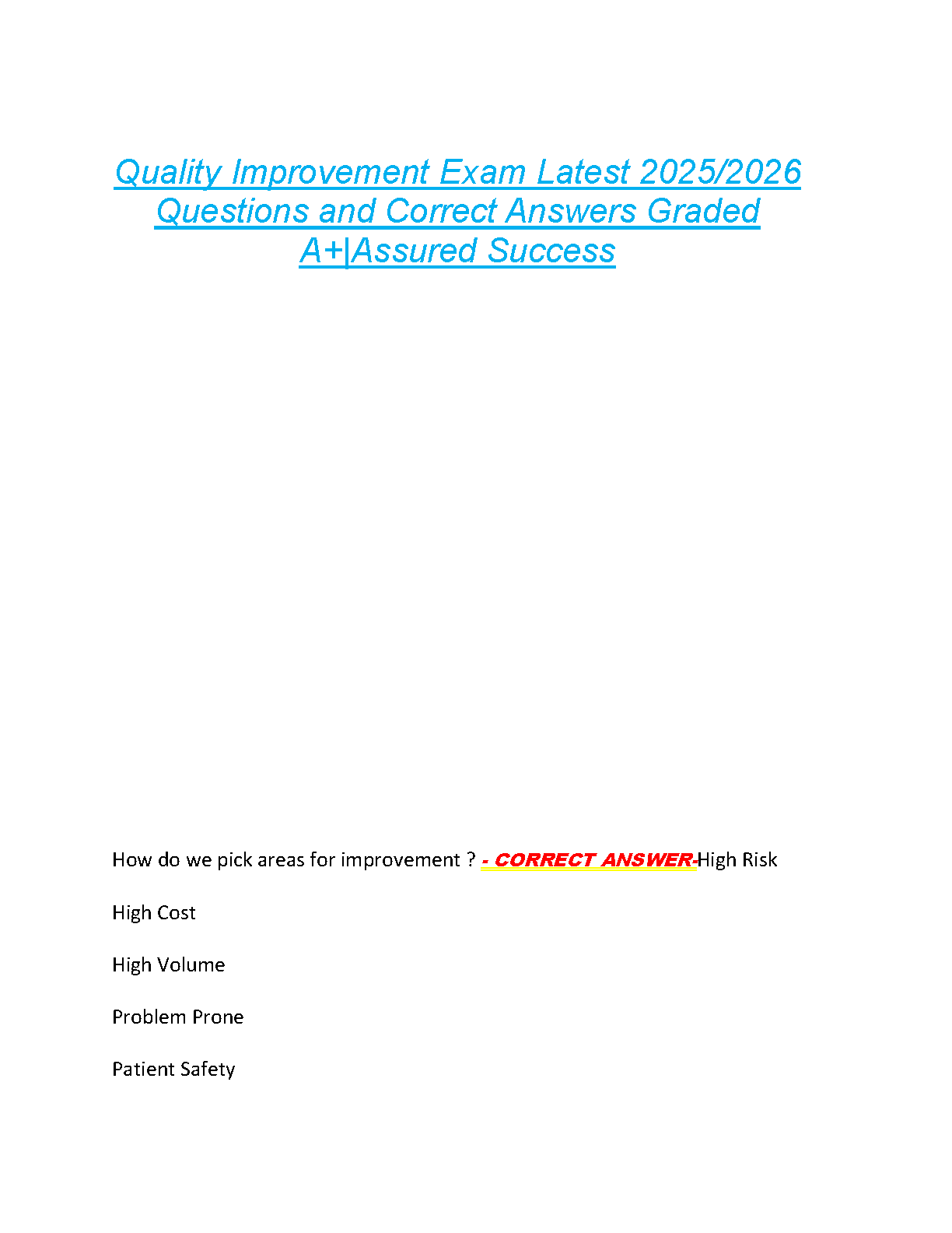 Unlock exam success with the most current Quality Improvement Exam Test Bank for the 2025/2026 academic year. This comprehensive resource is meticulously compiled with a wide range of exam-style questions and 100% correct, verified answers. Designed to help you master key concepts in quality improvement, from identifying high-risk areas to enhancing patient safety, this guide ensures you are fully prepared. Achieve an A+ grade and pass your exam on the first attempt, avoiding costly resits. Download now and start your journey to assured success!