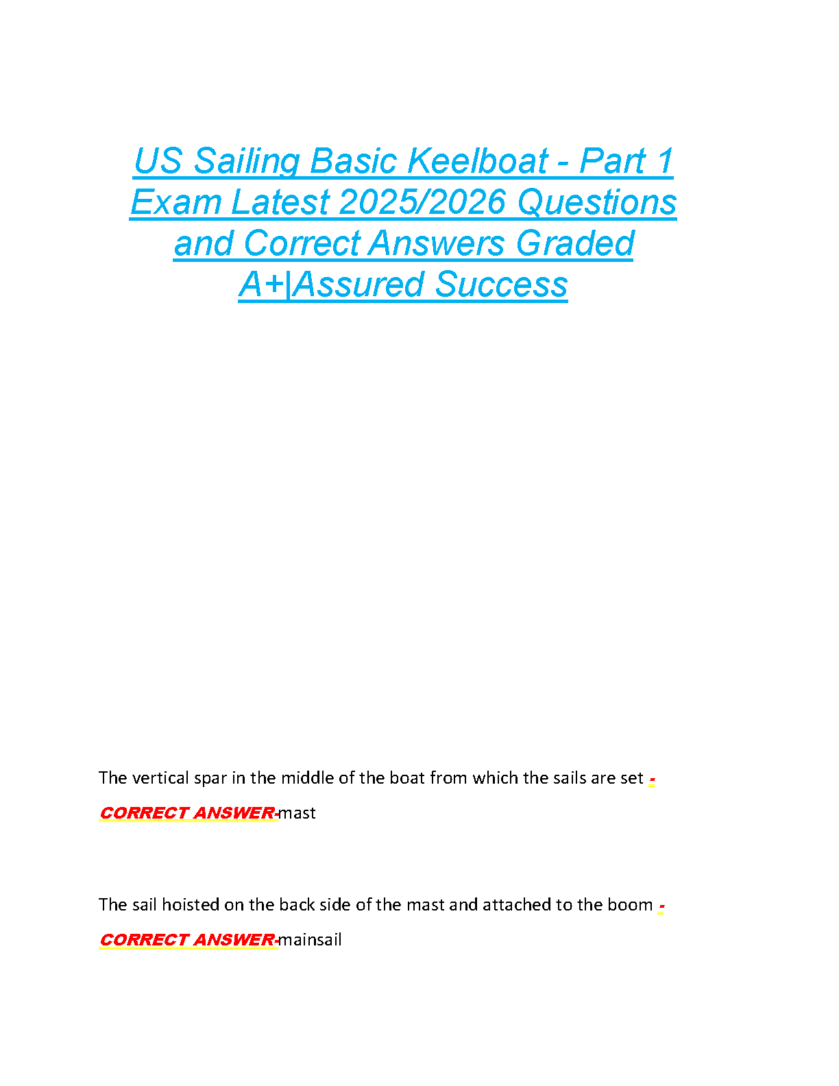 Master the essentials of sailing and ace your certification with our comprehensive test bank for 'Basic Keelboat, 3rd Edition' by John Rousmaniere and US Sailing. This is the ultimate study resource for the 2025/2026 academic year, featuring a complete collection of the latest exam questions and 100% correct, verified answers. Each question is designed to mirror the actual US Sailing Basic Keelboat exam, covering all critical topics from sailing terminology and parts of the boat to safety procedures. Our guide is curated to guarantee an A+ grade, helping you pass your exam on the very first attempt and get out on the water with confidence.