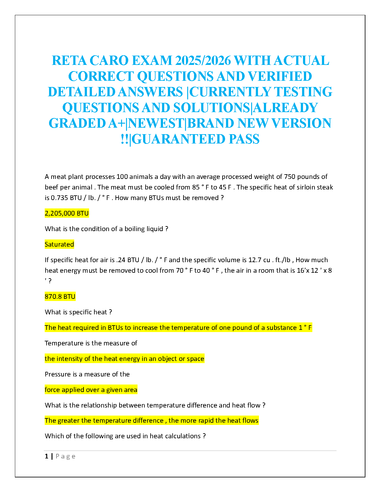 Ace your RETA Certified Assistant Refrigeration Operator (CARO) exam on the first try with our latest 2025/2026 test bank. This comprehensive study guide is meticulously compiled with currently tested questions and detailed, verified answers. Each solution is explained to ensure a deep understanding of core concepts in refrigeration, such as heat calculations, specific heat, and thermodynamics. Achieve an A+ grade and pass with confidence, avoiding costly and time-consuming resits. This is the ultimate resource for aspiring refrigeration operators looking for a guaranteed path to certification.