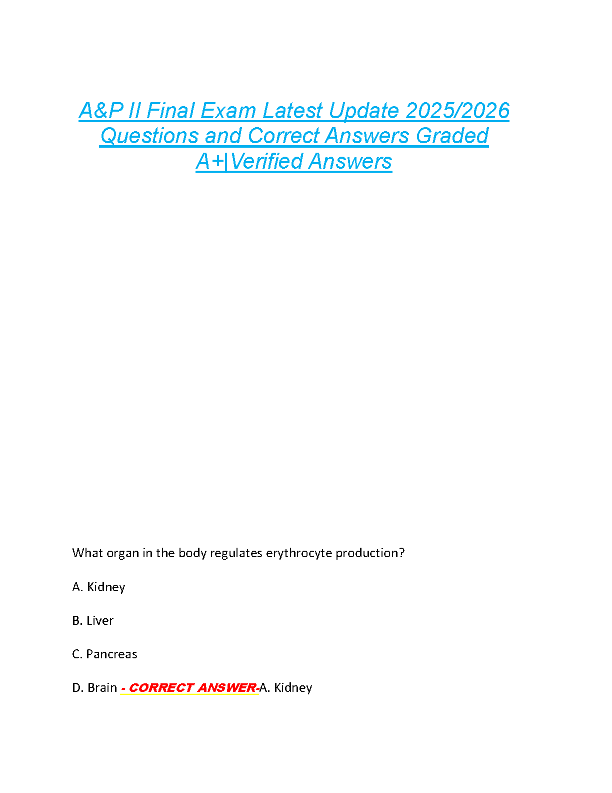 Excel in your Anatomy & Physiology II course with this comprehensive 2025/2026 Test Bank for the final exam, based on 'Human Anatomy & Physiology, 12th Edition' by Elaine N. Marieb and Katja Hoehn. This essential study tool provides a vast collection of exam-style questions accompanied by detailed, verified answers to guarantee an A+ grade. Prepare effectively, deepen your understanding of the human body, and pass your final exam on the first attempt with confidence. This is the ultimate resource to avoid resits and achieve academic success in A&P II.
