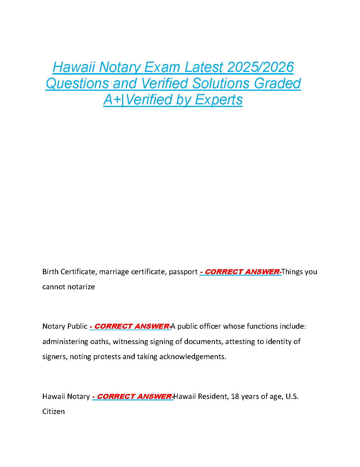Hawaii Notary Exam 2025/2026 Test Bank: A+ Graded Questions and Expert-Verified Answers