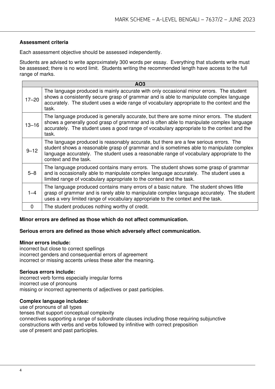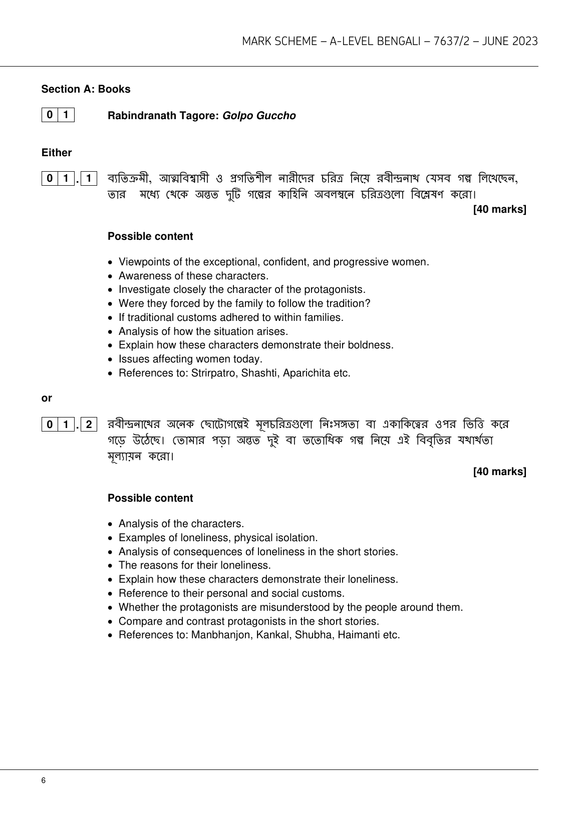AQA A LEVEL BENGALI PAPER 2 JUNE 2023 MARK SCHEME (7637/2: Writing)