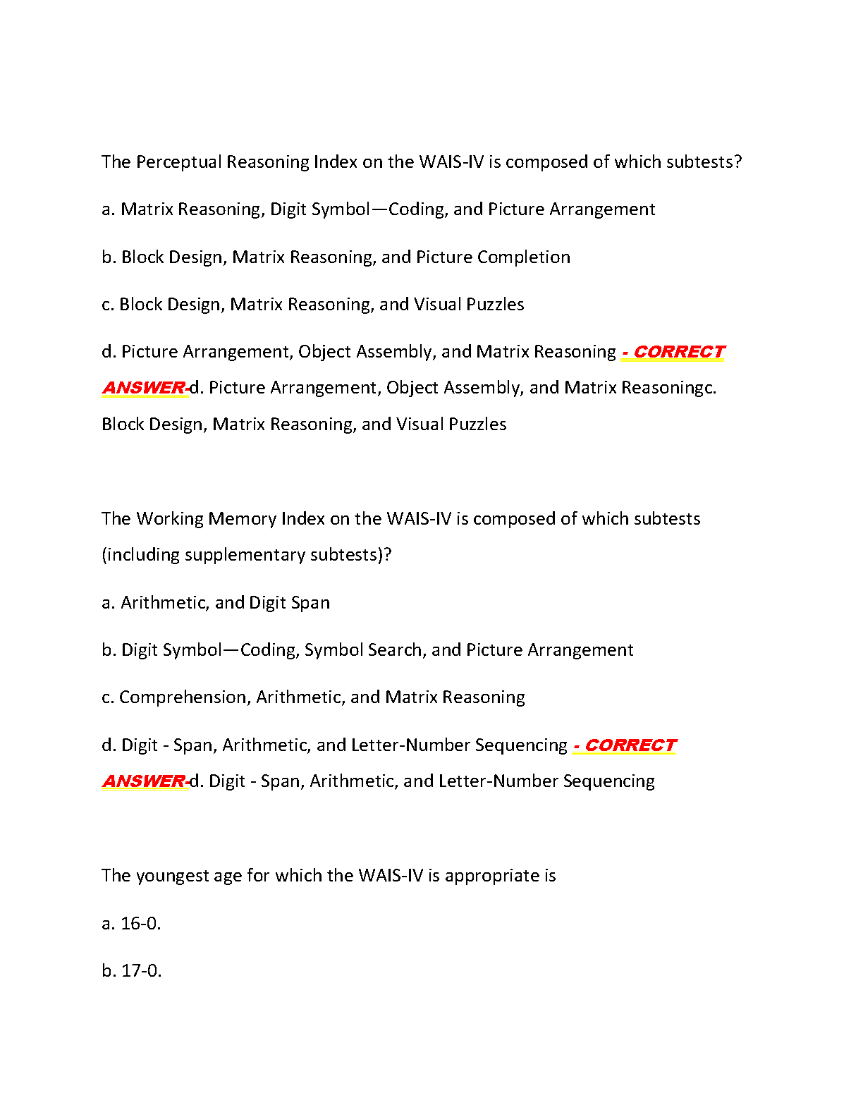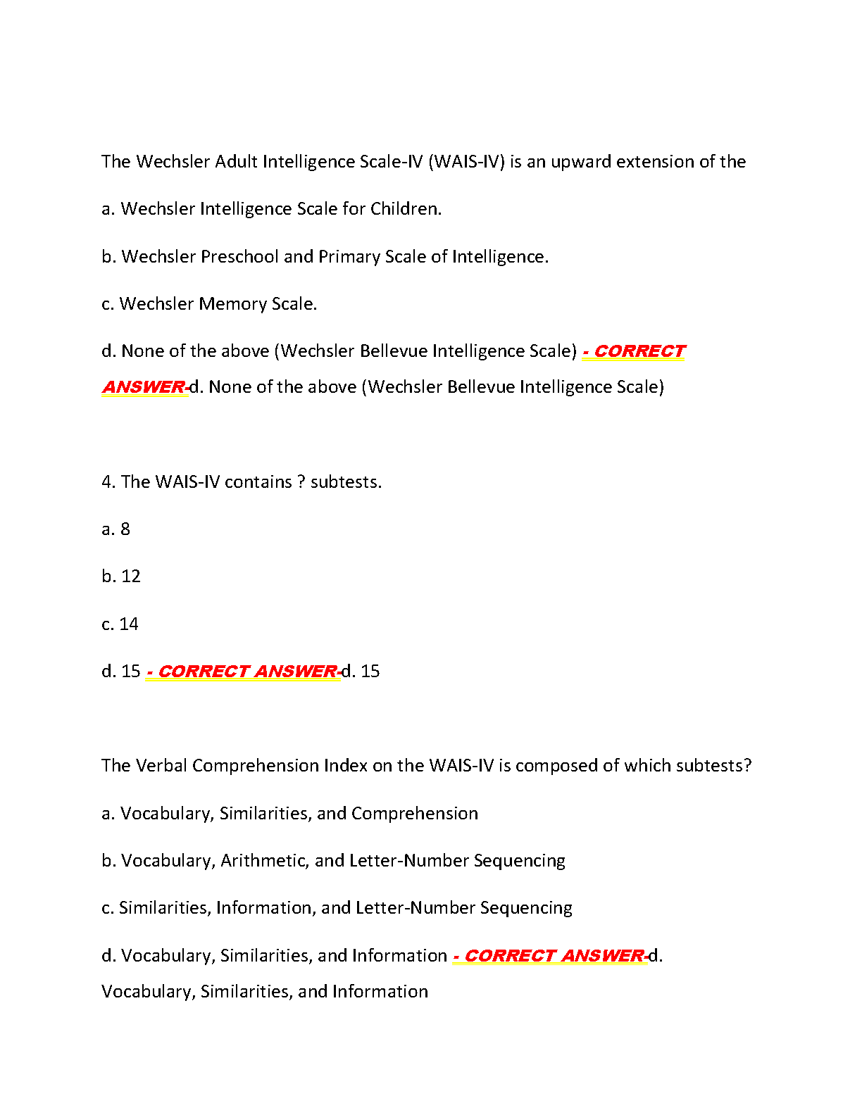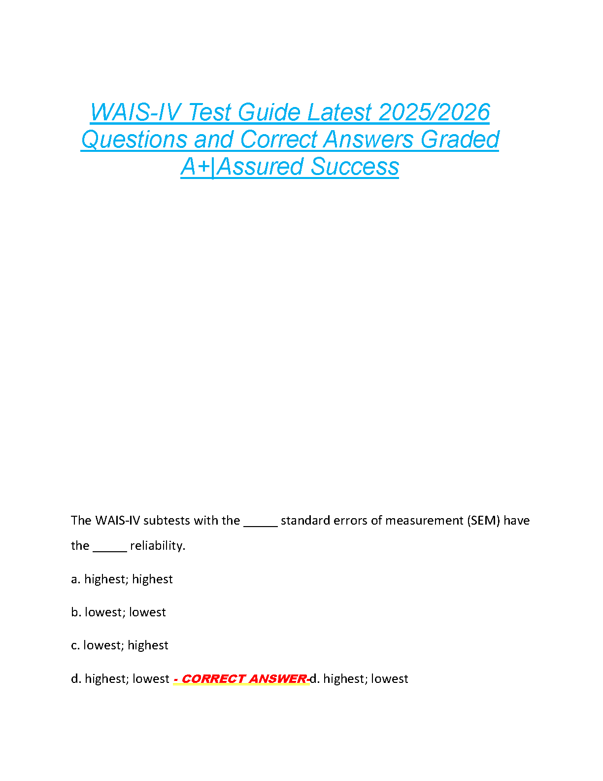 Unlock A+ results with this comprehensive test bank for the Wechsler Adult Intelligence Scale, Fourth Edition (WAIS-IV). This guide contains a vast collection of exam-style questions and verified correct answers, meticulously compiled to cover all key concepts. Ideal for psychology students and professionals preparing for certification, this resource is your ultimate tool for mastering the WAIS-IV assessment. Study effectively, understand the material deeply, and pass your exams with confidence on your first attempt.