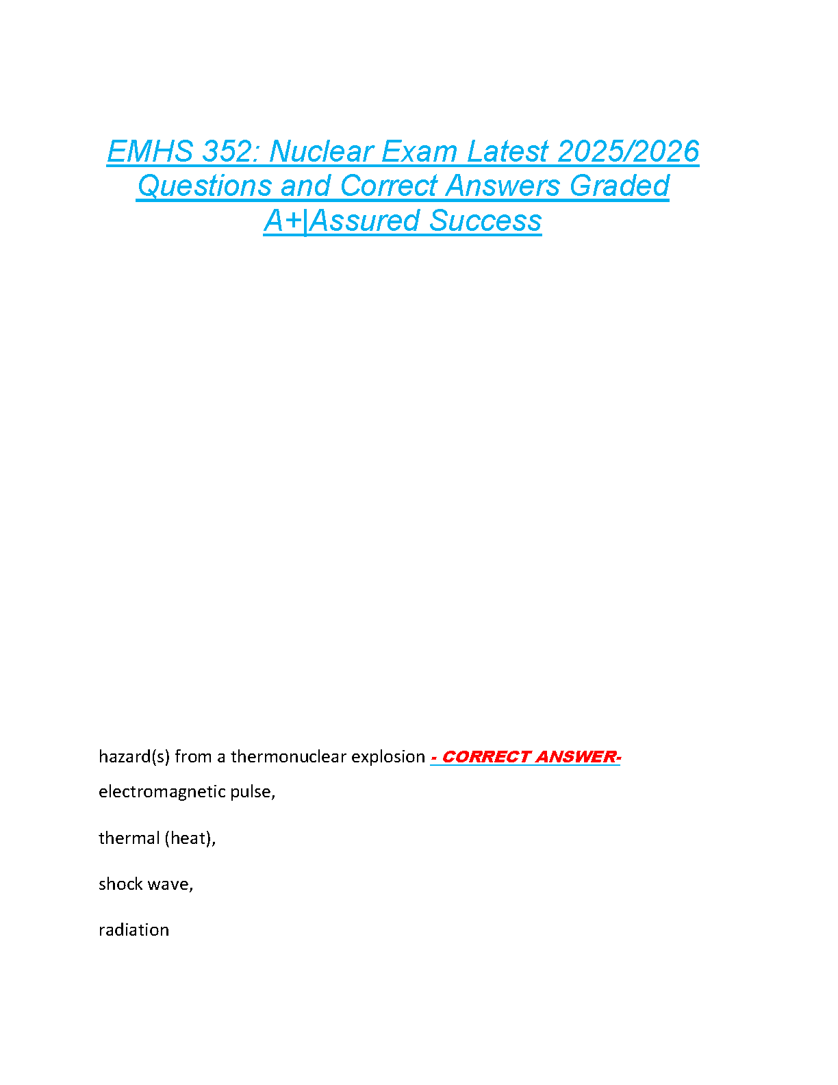 Ace your EMHS 352 Nuclear Exam with our newly updated 2025/2026 test bank. This comprehensive resource is packed with the latest exam questions and 100% correct, verified answers, ensuring you study the most relevant material. Designed for guaranteed success, this study guide helps you master complex topics like thermonuclear hazards, radiation, and more, so you can walk into your exam with confidence. Secure your A+ grade and pass on your first attempt, avoiding the stress and expense of resits.