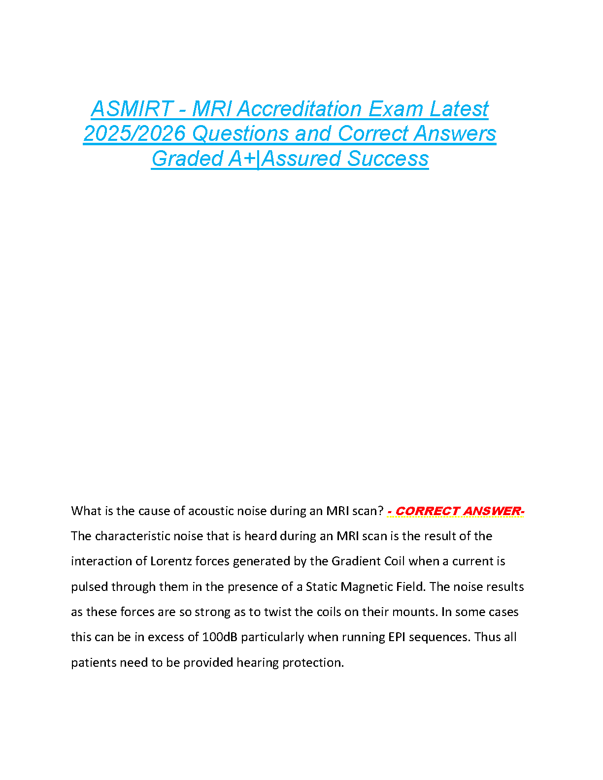 Prepare to excel in your ASMIRT MRI Accreditation Exam with our ultimate 2025/2026 test bank. This comprehensive study guide features an extensive collection of the latest exam questions, each with verified, correct answers to ensure you master the material. Covering essential topics like MRI physics and safety protocols, this resource is designed to help you achieve a Grade A+ and pass your accreditation on the first try. Gain the confidence you need for assured success.