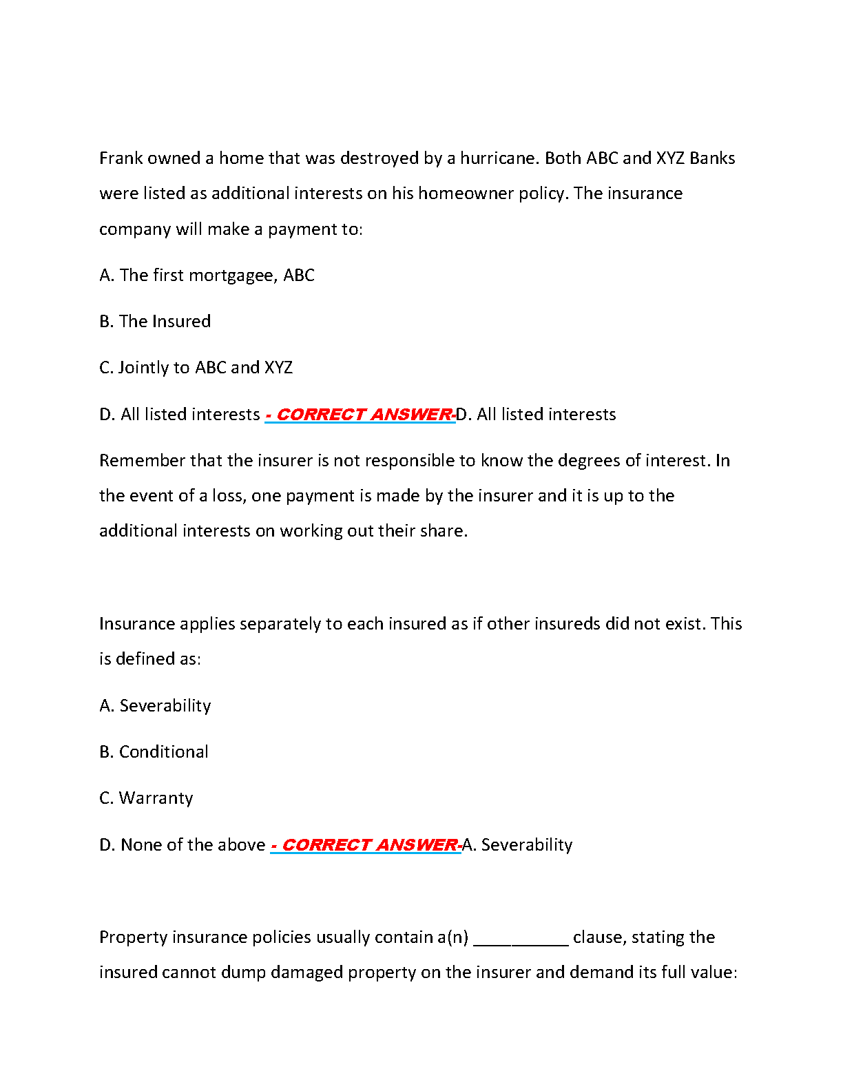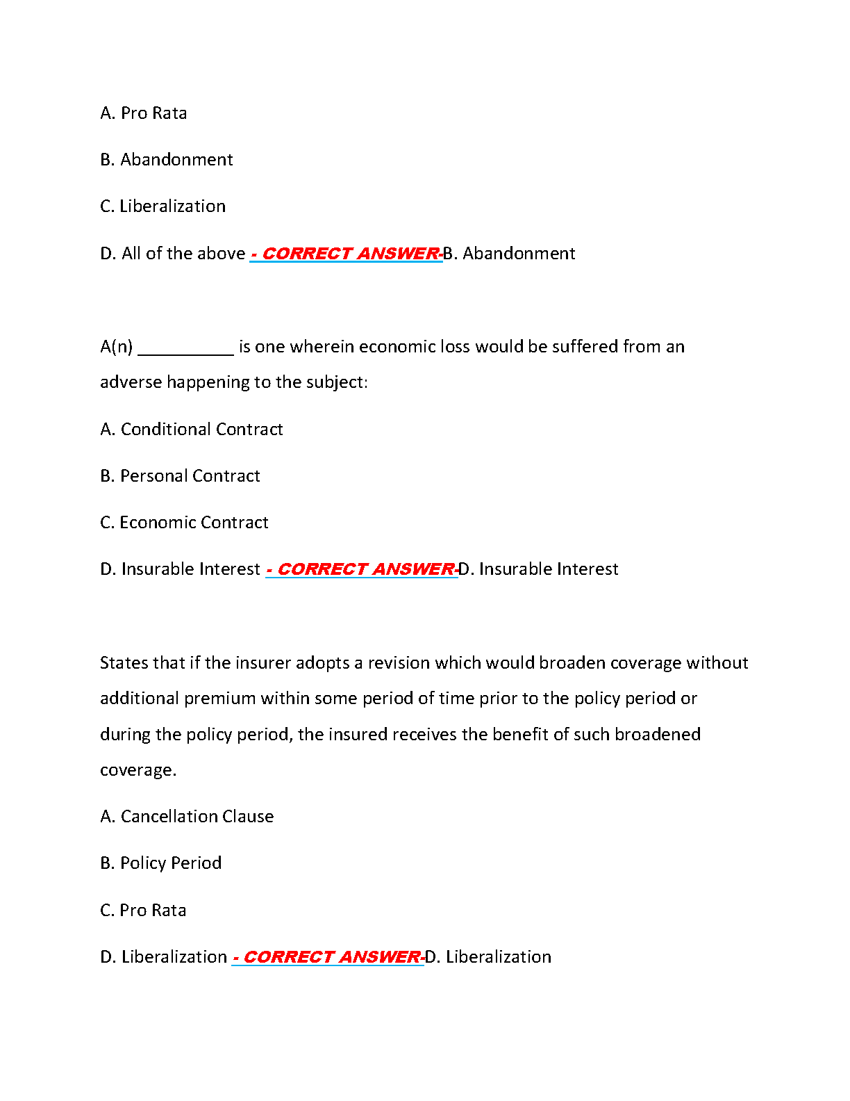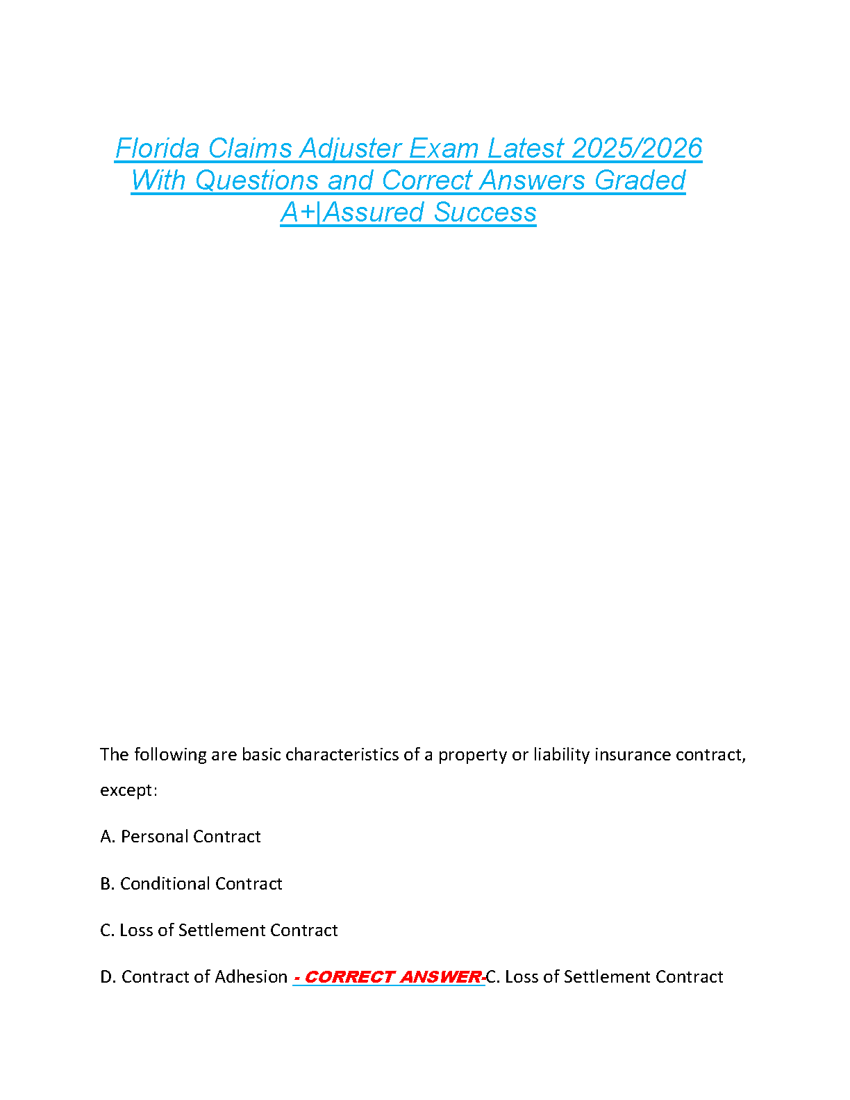 Unlock guaranteed success on your Florida Claims Adjuster exam with our latest 2025/2026 test bank. This premium study resource is expertly compiled with a full range of potential exam questions, each accompanied by precise, correct answers. Designed to help you master the material efficiently, this guide is your key to passing on the first try and confidently starting your career as a claims adjuster. Avoid the stress of resits by preparing with A+ graded material that covers all essential topics.