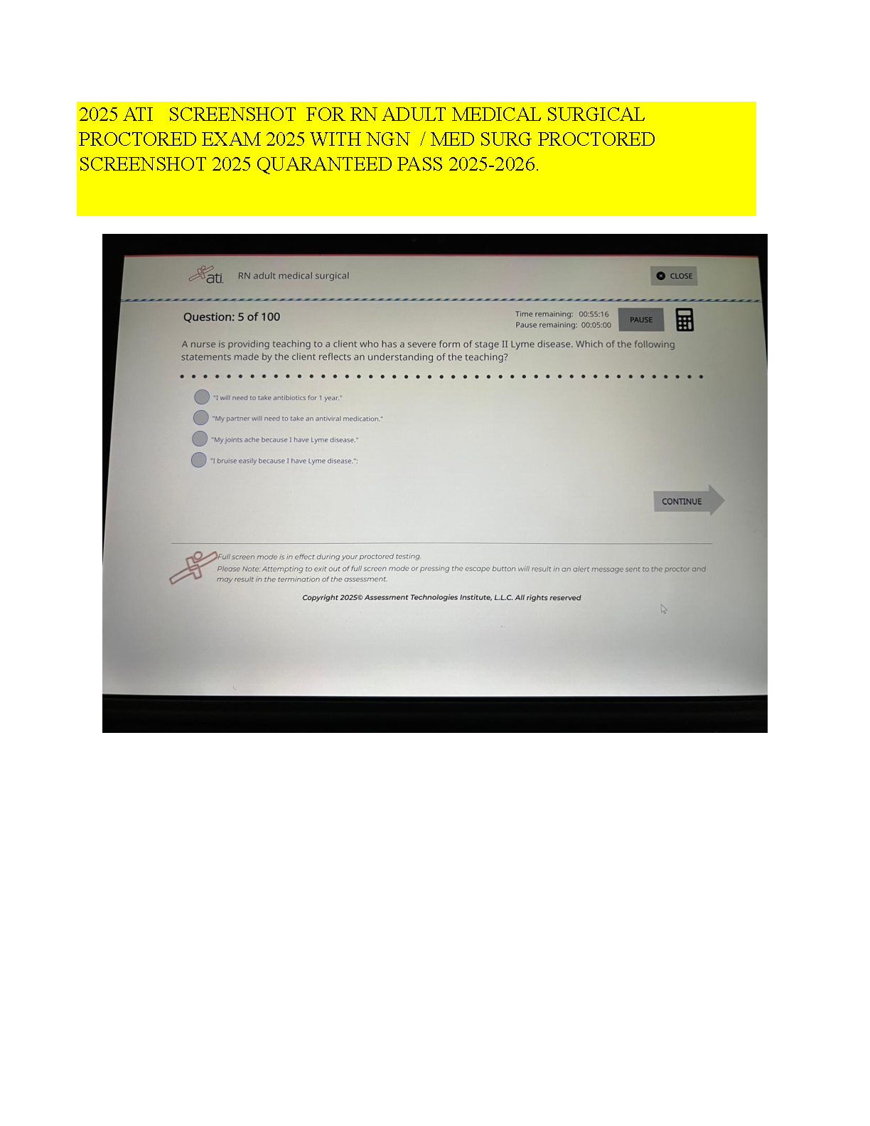 Prepare to excel in your nursing studies with our definitive study guide for the ATI RN Adult Medical-Surgical Proctored Exam for the 2025-2026 academic year. This resource is meticulously compiled with the latest NGN-style questions and detailed answers, reflecting the actual exam format. By studying with these real exam screenshots, you'll gain the confidence and knowledge needed to master complex medical-surgical concepts. This guide is your key to passing the proctored exam on your very first attempt, saving you time and stress. Get instant access and start your journey towards a guaranteed pass today!