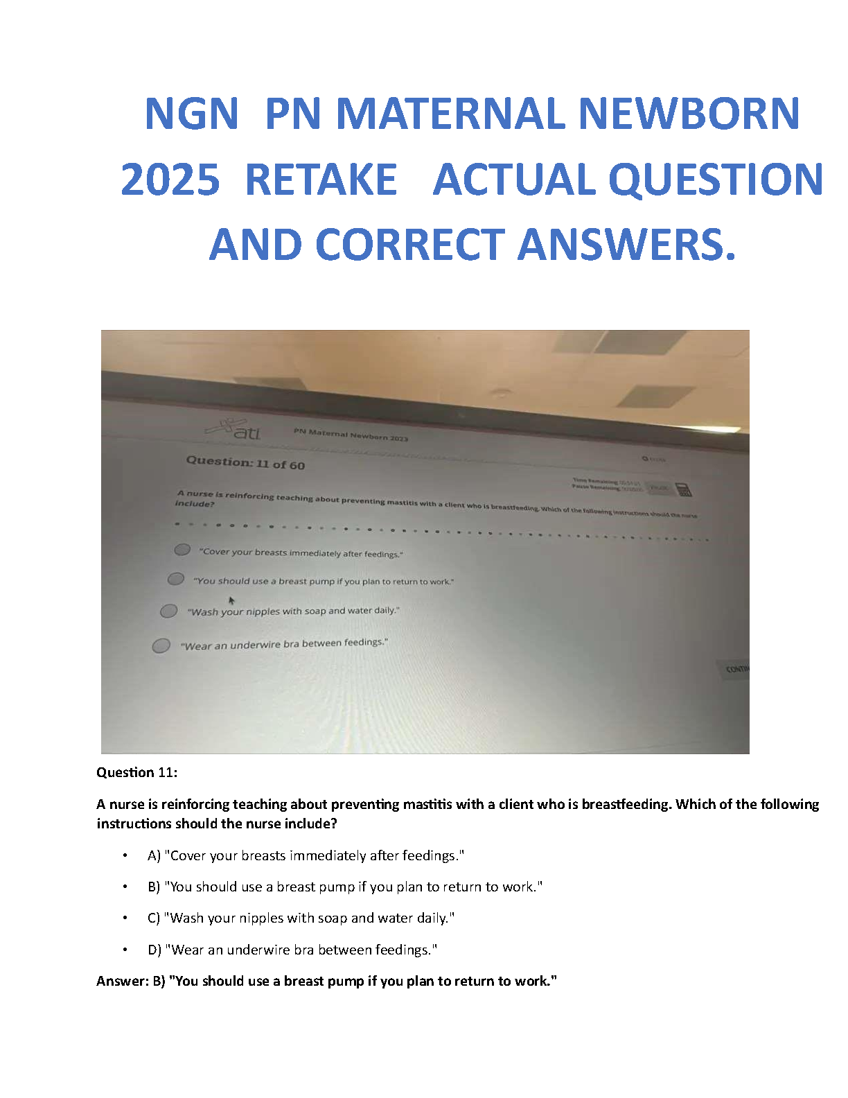 Ace your upcoming ATI PN Maternal Newborn NGN exam with this comprehensive test bank, updated for the 2025/2026 academic year. This essential study guide features a curated collection of actual exam questions, complete with verified, correct answers. Designed to help you master crucial concepts in maternal and newborn nursing care, this resource is your key to success. Whether you're taking the exam for the first time or preparing for a retake, our practice questions will build your confidence and ensure you're fully prepared. Stop worrying about resits and secure a top score with this ultimate preparation tool.
