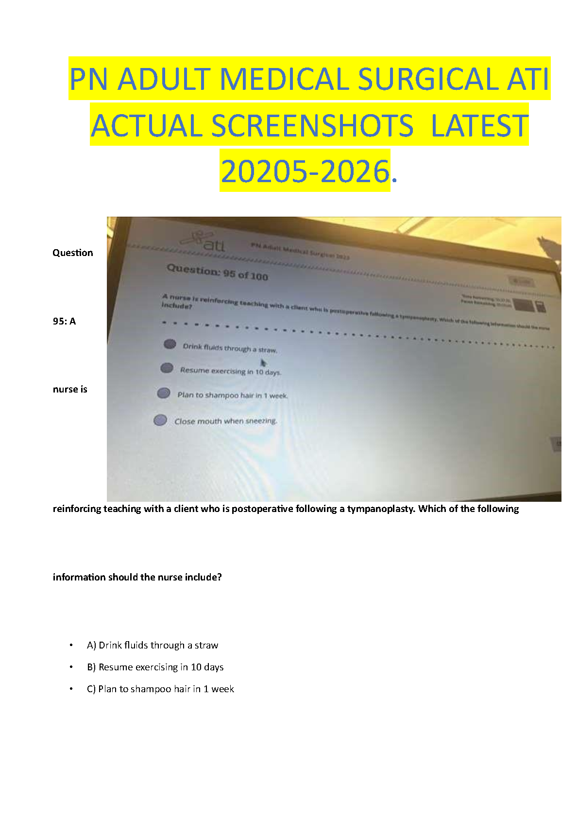 Unlock success on your PN Adult Medical-Surgical ATI exam with our definitive 2025-2026 test bank. This study guide is packed with actual exam questions and verified answers, taken directly from recent tests to give you a real-world advantage. Master complex topics, such as postoperative tympanoplasty care, and build the confidence you need to excel. Designed for nursing students aiming for a first-time pass, this resource is your most reliable tool to avoid resits and achieve your certification goals.