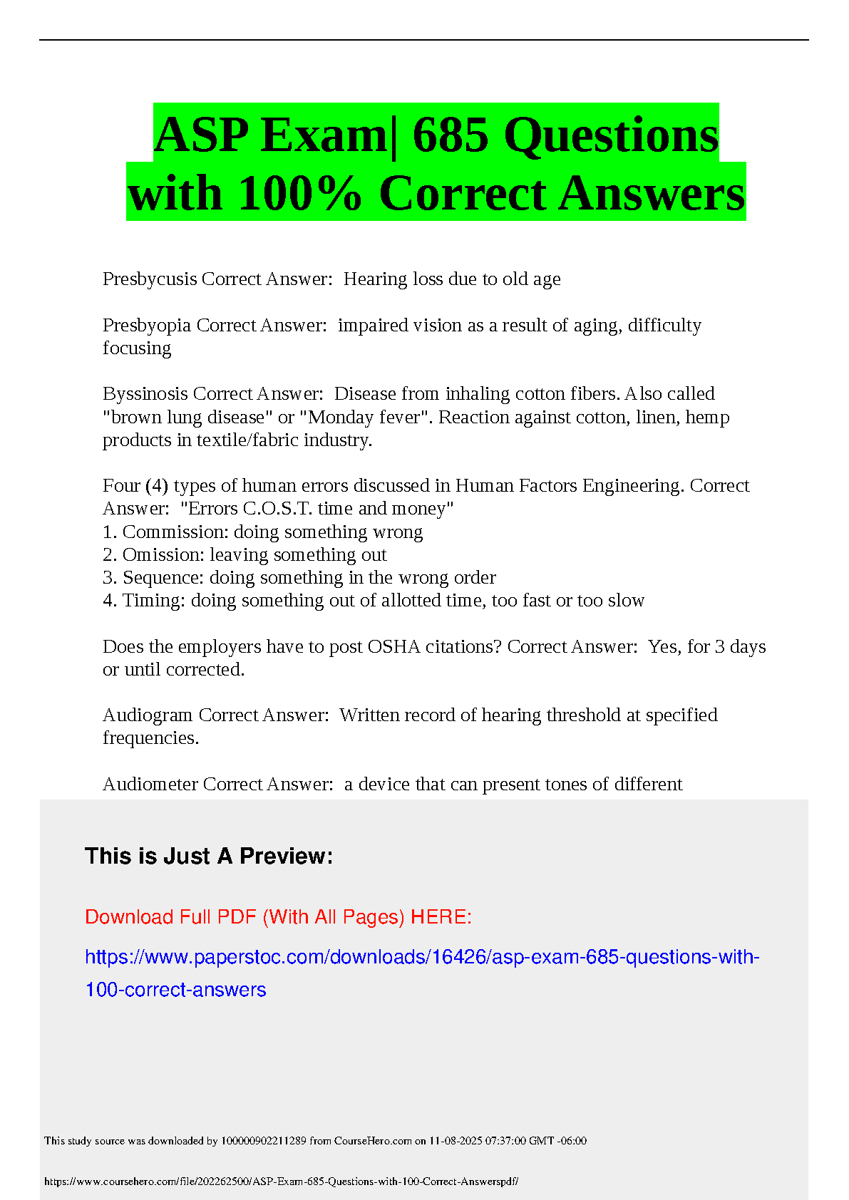 Prepare to excel in your Associate Safety Professional (ASP) certification with our latest 2025/2026 test bank. This essential study resource features an extensive collection of 685 practice questions, each with a 100% correct and verified answer. Our test bank covers all critical domains of the ASP exam, including occupational health hazards, human factors engineering, OSHA regulations, and more. Designed to simulate the real exam experience, this guide is your key to mastering the material, boosting your confidence, and passing the ASP exam on your very first attempt. Avoid the stress of resits—get the ultimate preparation tool today and secure your professional certification.