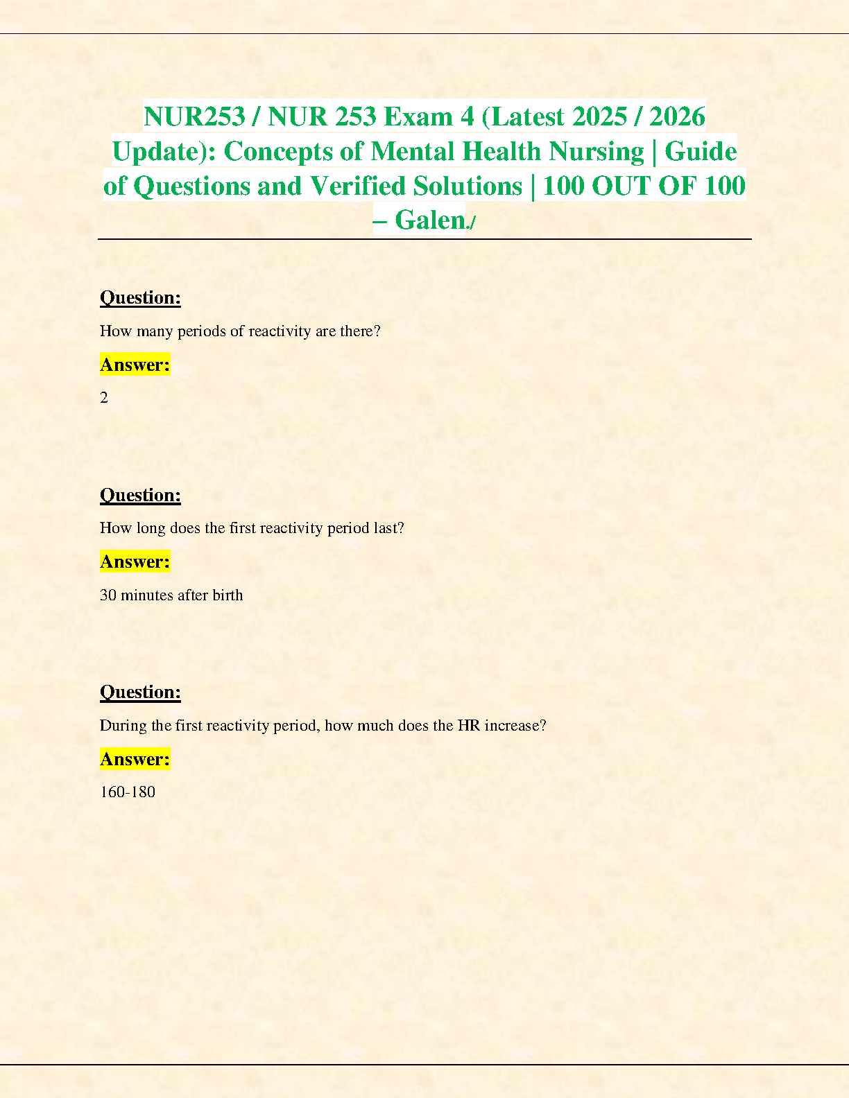Get ready to ace your NUR 253 Exam 4 at Galen College with this comprehensive test bank. This guide, updated for the 2025-2026 academic year, covers all key topics in Concepts of Mental Health Nursing. It features a complete set of questions with verified, 100% correct answers to ensure you are fully prepared. Master the material, understand the exam format, and walk into your test with confidence. This is the ultimate study tool to help you pass on your first try and achieve a top score.