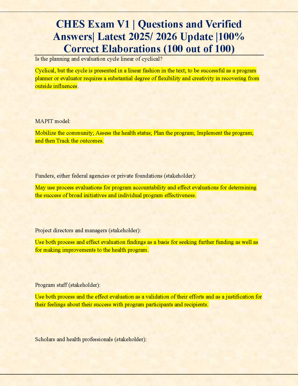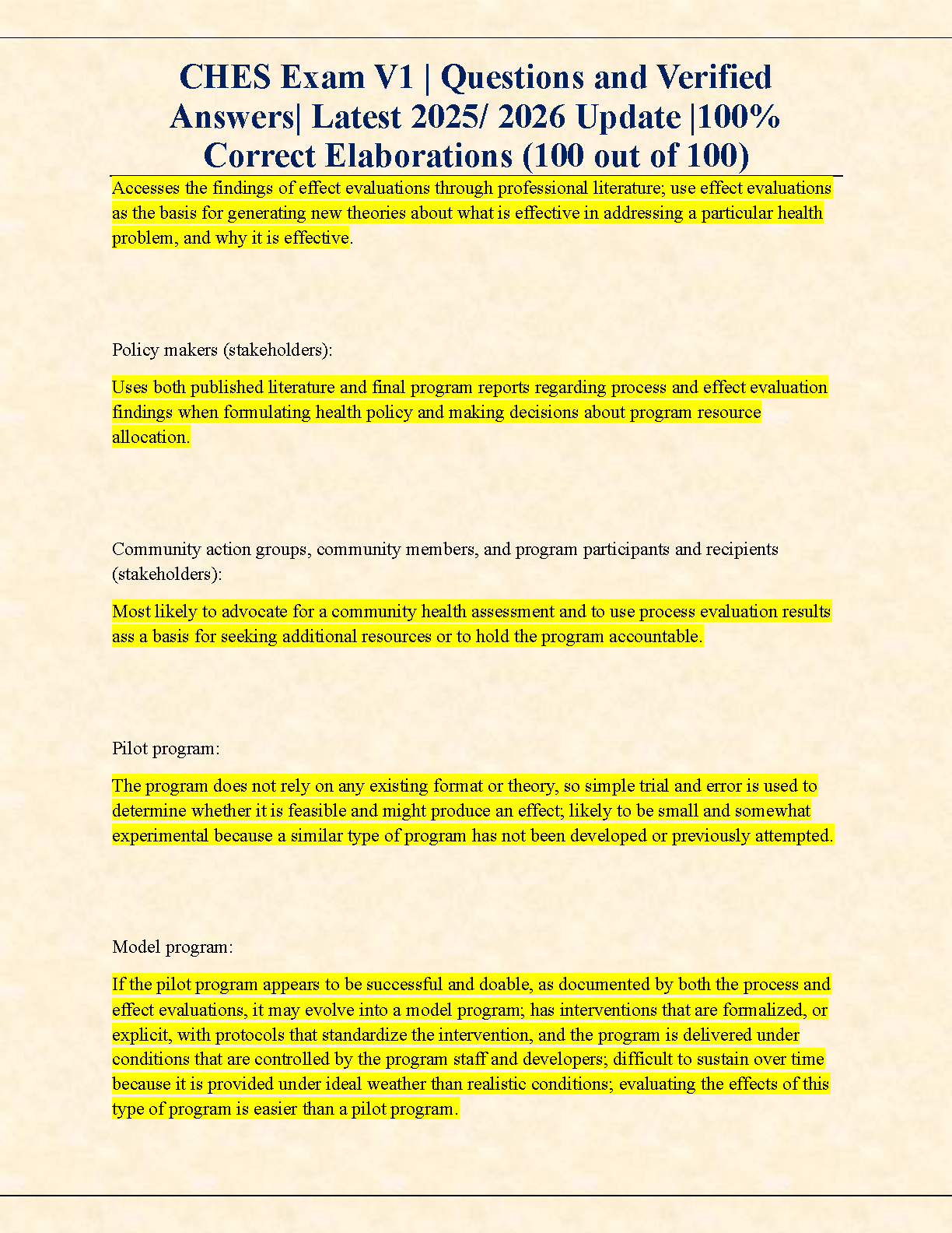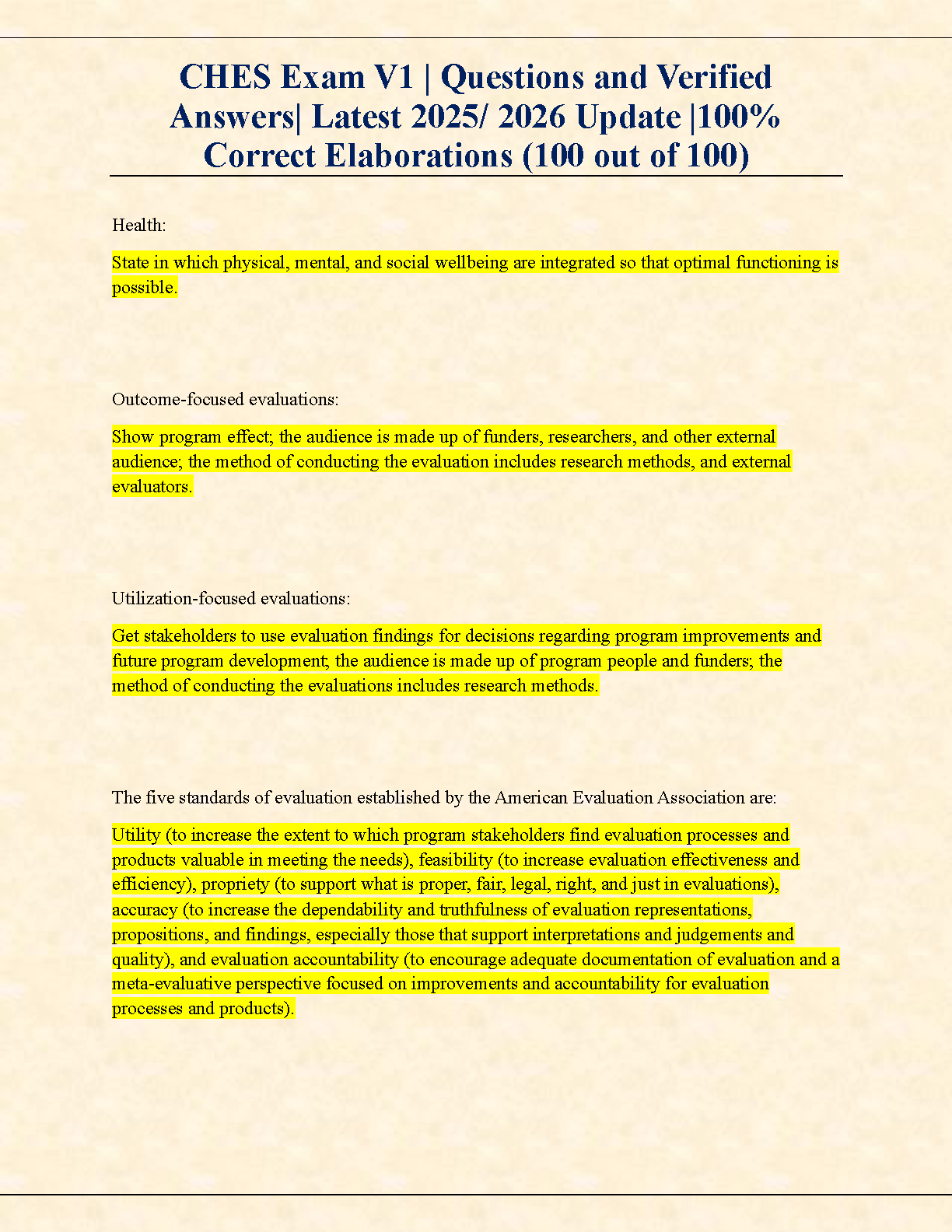 Prepare to excel in your Certified Health Education Specialist (CHES) exam with our comprehensive Test Bank for the 2025/2026 academic year. This V1 guide is meticulously crafted with a complete set of questions, 100% verified answers, and in-depth elaborations. Master key concepts such as the definition of health, outcome-focused vs. utilization-focused evaluations, and the five standards of evaluation established by the American Evaluation Association. This resource is your ultimate tool to build confidence, understand complex topics, and pass your CHES exam on the very first attempt, avoiding costly resits. Get instant access to this latest, updated material and start your journey to certification today!