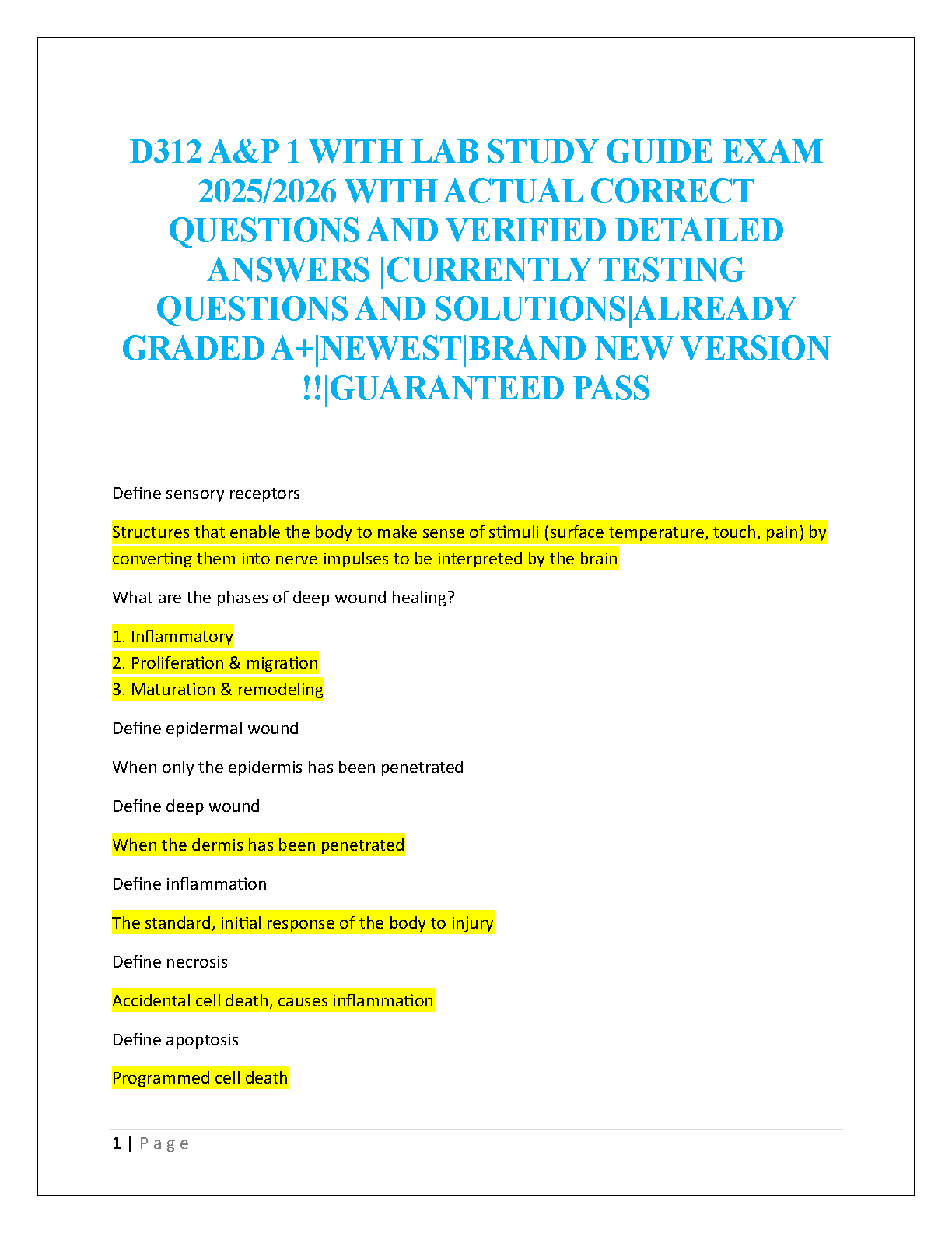 Ace your WGU D312 Anatomy and Physiology 1 with Lab exam on the first try with our comprehensive 2025/2026 study guide. This brand-new resource is meticulously designed to help you avoid resits by providing a complete set of actual exam questions and expertly verified, detailed answers. Achieving an A+ grade is within your reach, as this guide covers all essential topics, including sensory receptors, the phases of wound healing, inflammation, and cellular processes. Unlock success and pass with confidence using this ultimate study companion, updated for the latest curriculum.