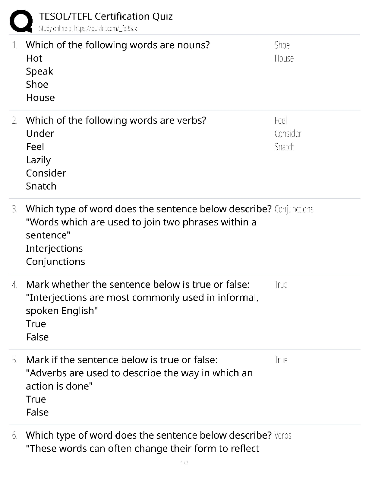 Ace your TESOL or TEFL certification with our exclusive quiz-style test bank. This resource provides a comprehensive review of essential English grammar concepts, including a detailed breakdown of nouns, verbs, conjunctions, adverbs, and interjections. Each question comes with a clear, verified answer to help you quickly identify your strengths and weaknesses. Perfect for final exam preparation, this study guide is designed to boost your confidence and ensure you pass your certification on the first try. Get instant access to these critical practice questions and take the first step towards your teaching career!