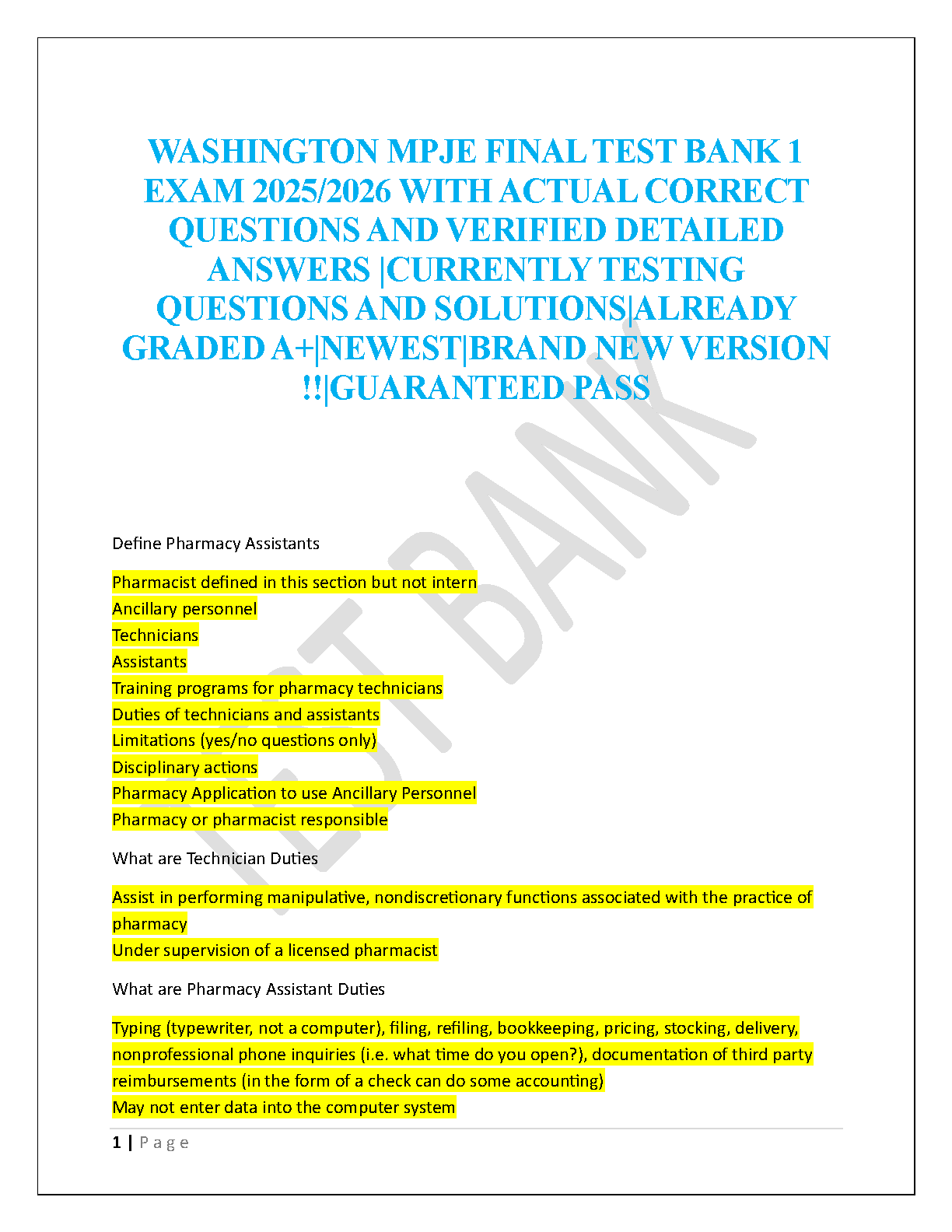 Ace the Washington Multistate Pharmacy Jurisprudence Examination (MPJE) on your first try with our latest 2025/2026 Test Bank. This comprehensive study guide features a complete set of actual exam questions paired with expertly verified, detailed answers and solutions. Already graded A+, this resource provides the most current and relevant material to build your confidence and ensure a guaranteed pass. Master Washington's pharmacy laws and regulations effectively and avoid the stress of a resit.