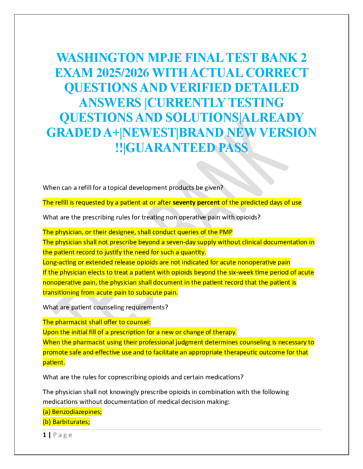 Ace your Washington Multistate Pharmacy Jurisprudence Examination (MPJE) with this comprehensive Test Bank for the 2025-2026 academic year. This study guide is meticulously crafted to help you pass on your first attempt, featuring a vast collection of exam-style questions paired with verified, in-depth answers and solutions. Covering critical areas of Washington pharmacy law, including opioid prescribing rules, patient counseling requirements, and prescription refills, this resource is your key to mastering the material. Updated for the latest exam format and graded A+, this test bank ensures you have the most current and relevant information to walk into your exam with confidence and succeed.