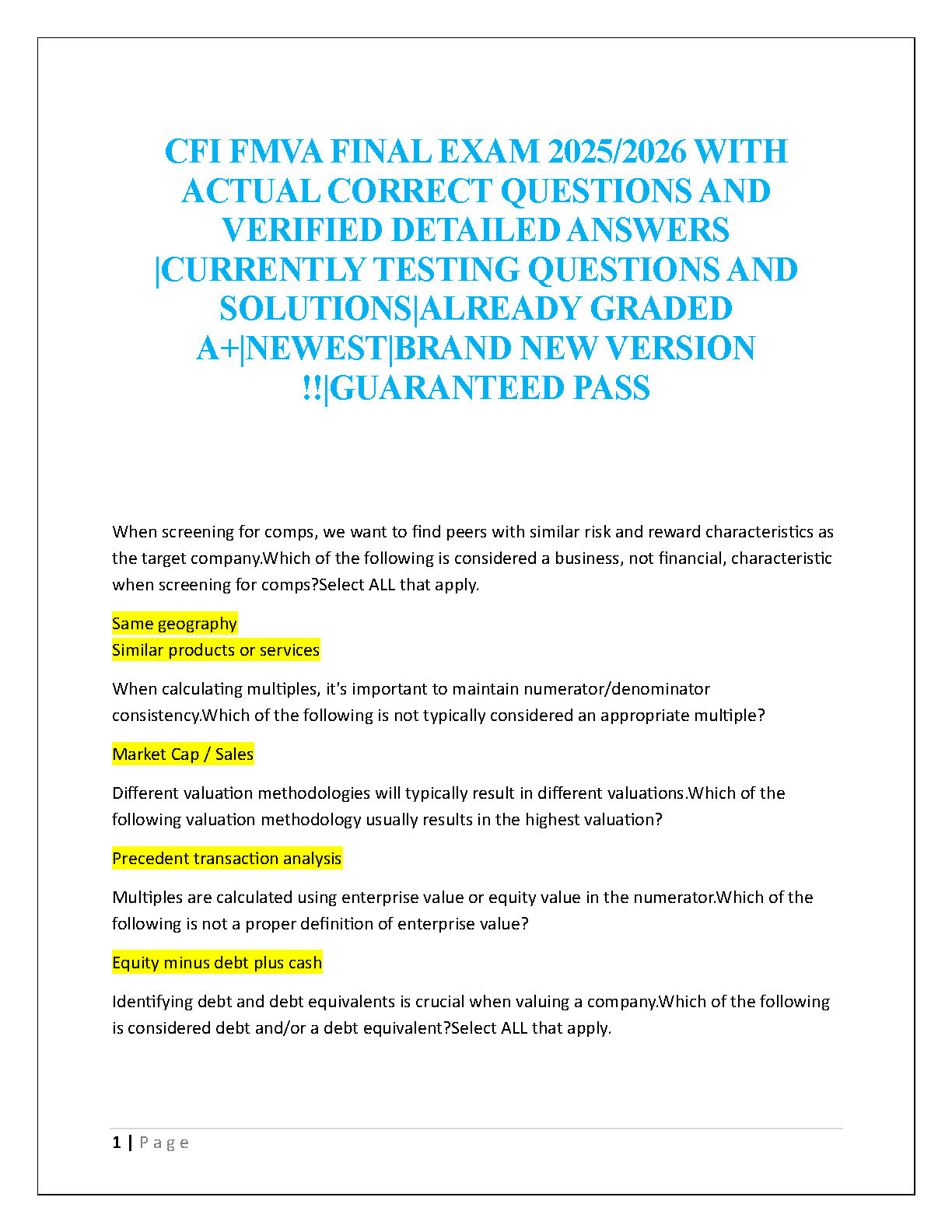 Ace your Corporate Finance Institute (CFI) Financial Modeling & Valuation Analyst (FMVA) certification with our latest 2025/2026 Final Exam Test Bank. This comprehensive study guide features a complete collection of actual, verified questions and detailed, A+ graded answers. Designed to mirror the real exam, our resource covers all key topics, ensuring you are fully prepared to pass on your first attempt and avoid costly resits. Get immediate access to the newest version and confidently secure your FMVA certification!