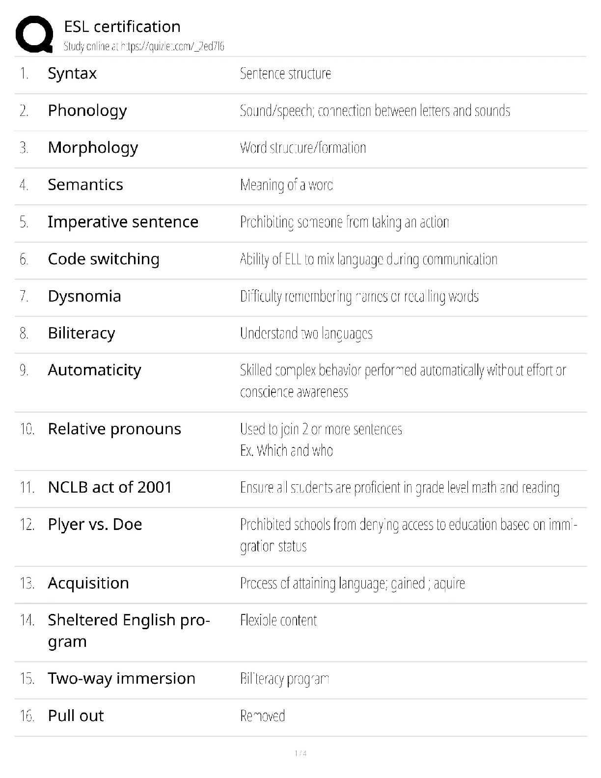 Master the essential concepts for your ESL certification with our expertly curated 2025/2026 study guide. This comprehensive resource breaks down critical topics, including linguistics (syntax, phonology, morphology), language acquisition theories, key legal precedents like NCLB Act and Plyer v. Doe, and essential teaching terminologies. Designed for aspiring ESL teachers, this guide provides clear, concise definitions to help you build a strong foundation and pass your certification exam with confidence on the first try. Avoid resits and fast-track your teaching career with these essential exam notes.