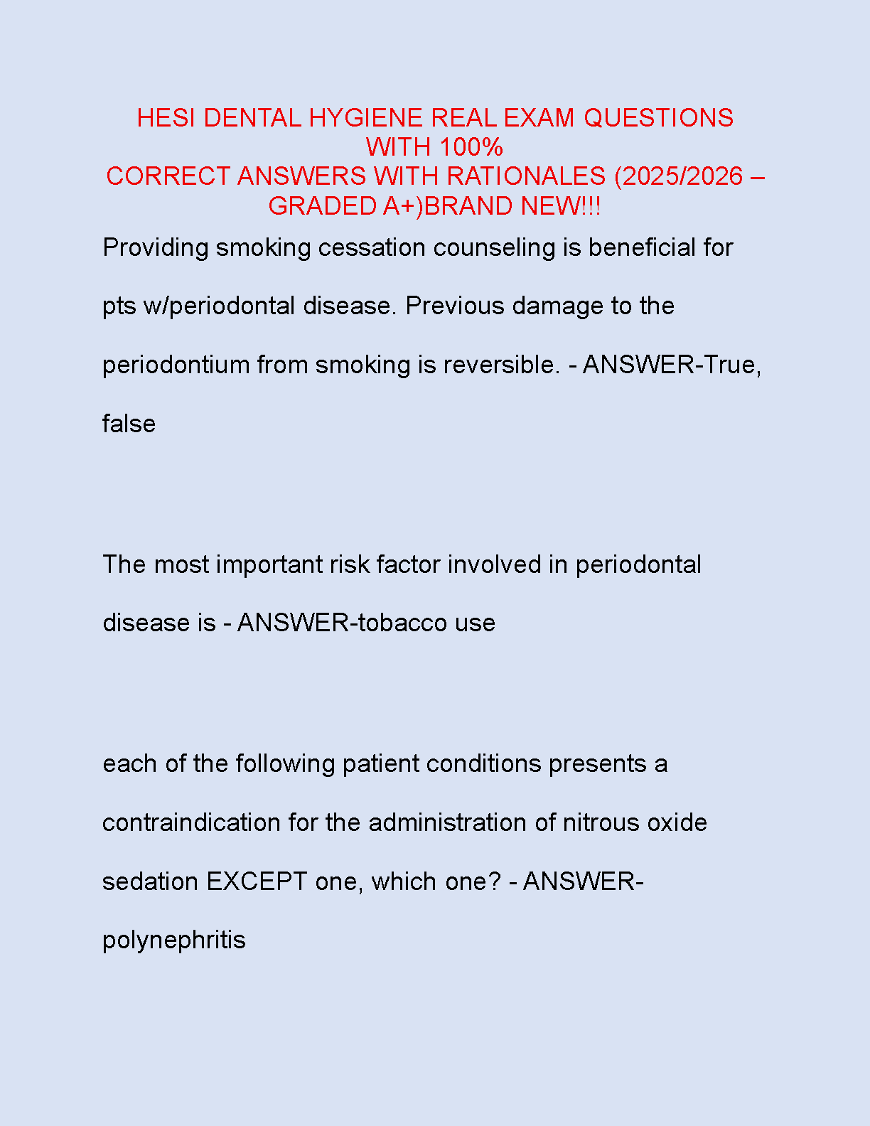 Unlock your potential and ace the HESI Dental Hygiene exam with our brand new 2025/2026 test bank. This comprehensive study guide features a complete collection of real exam questions, each paired with 100% accurate answers and detailed rationales. Designed for students aiming for an A+ grade, this resource covers all critical topics to ensure you pass confidently on your first try. Stop worrying about resits and start preparing for success with the ultimate tool for your dental hygiene certification.