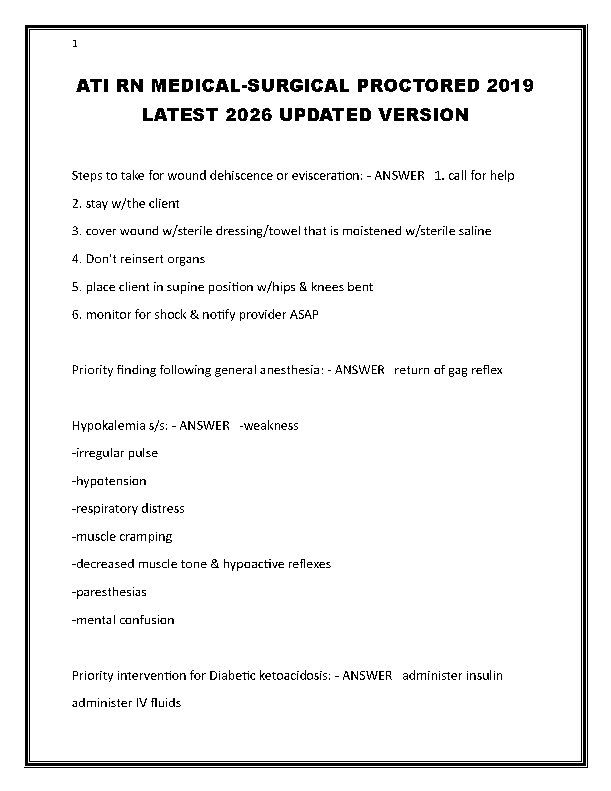 Master your nursing studies with the latest and most comprehensive ATI RN Medical-Surgical Proctored Exam Test Bank, updated for the 2025/2026 academic year. This essential study guide is meticulously crafted to ensure you pass your exams on the first attempt, avoiding costly and stressful resits. It features a vast collection of questions with detailed, verified answers covering crucial topics such as wound dehiscence, post-anesthesia priorities, hypokalemia, and diabetic ketoacidosis. Excel in your course and build a strong foundation for your NCLEX with this indispensable resource.
