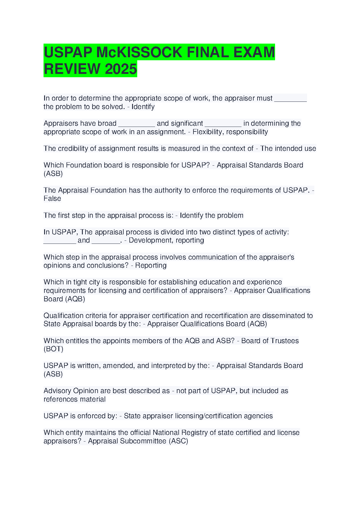 USPAP McKissock Final Exam Review 2025 Test Bank: Questions and Answers to Ace Your Appraisal Certification