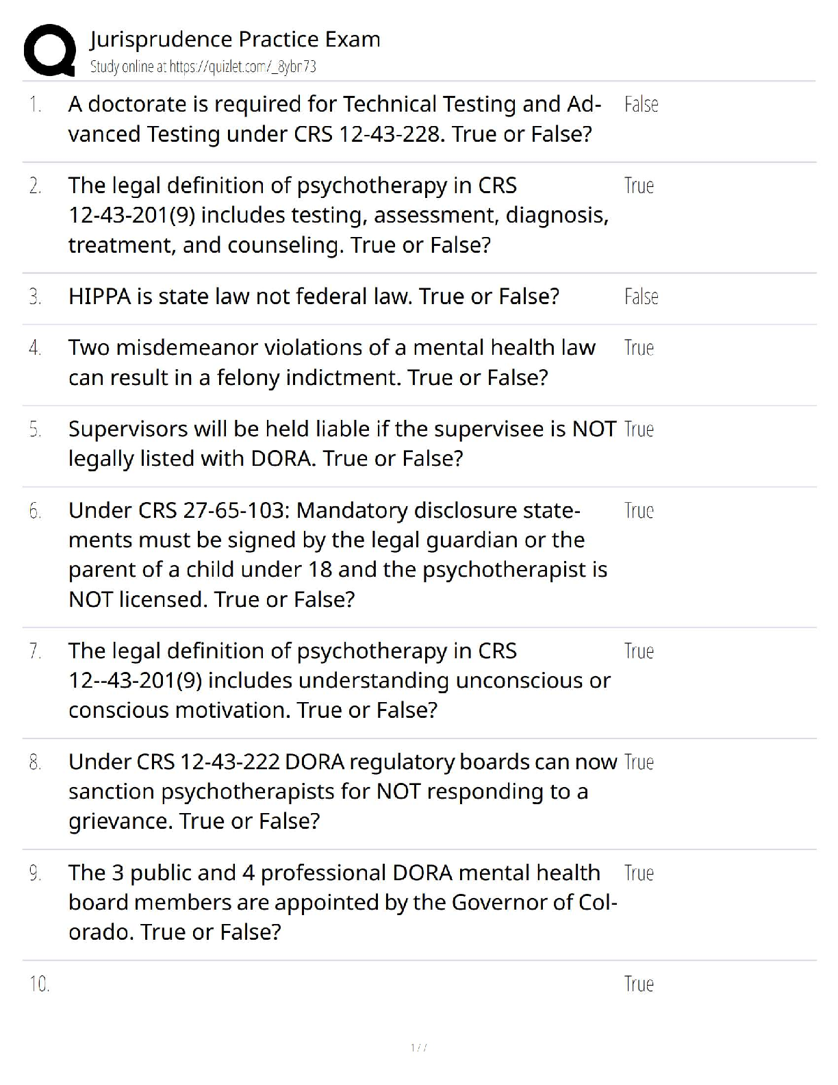 Ace the Colorado Mental Health Jurisprudence Exam on your first attempt with this comprehensive and up-to-date 2025/2026 test bank. This essential study resource provides a complete set of practice questions and detailed, verified answers covering all critical areas of Colorado law, DORA regulations, and ethical standards for mental health professionals. Master the material, build confidence, and secure your license without the stress of resits. Perfect for aspiring LPCs, LCSWs, LMFTs, and psychologists in Colorado.