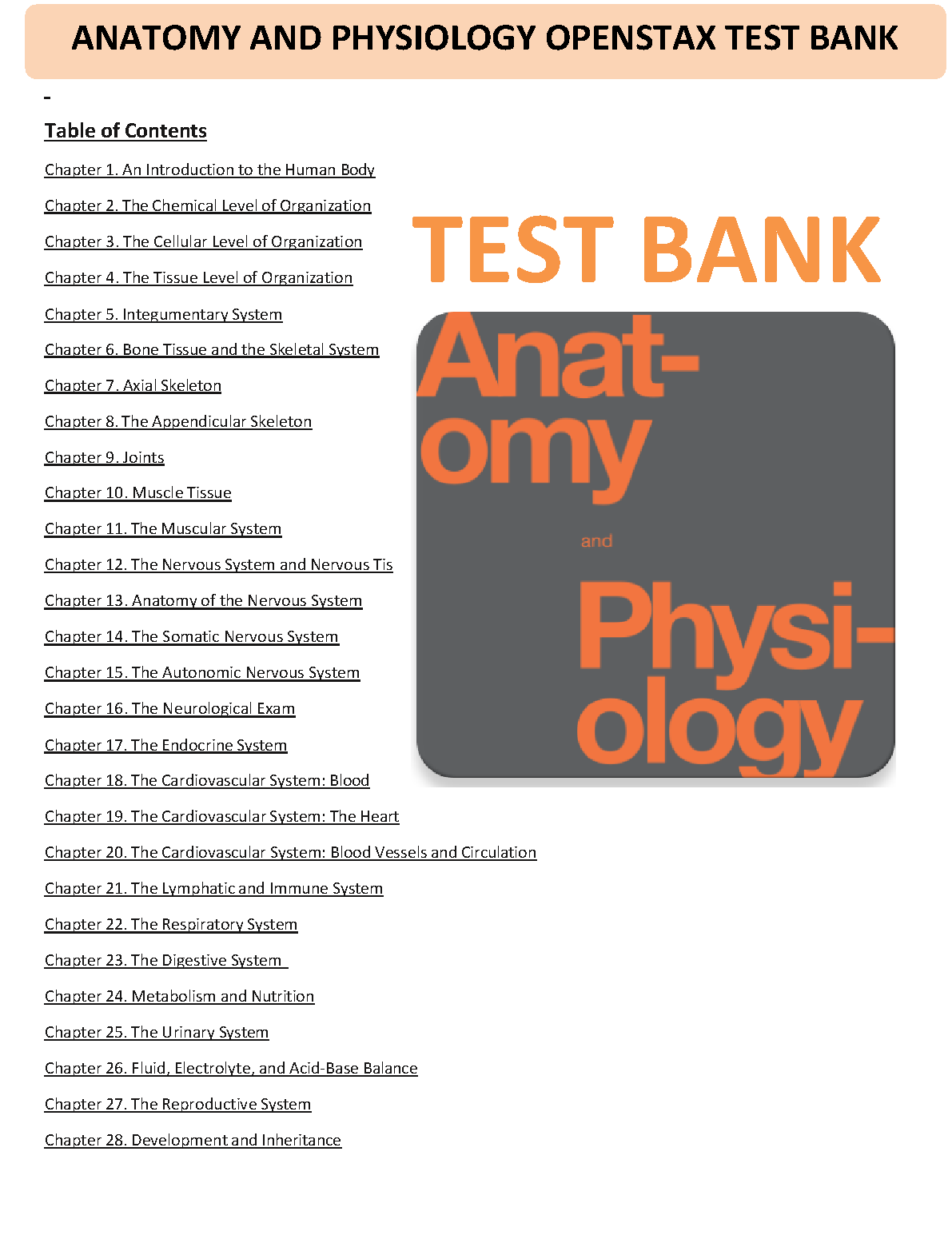 Master your Anatomy and Physiology course with the official Test Bank for the OpenStax 2nd Edition textbook by J. Gordon Betts, Kelly A. Young, and James A. Wise. This essential study tool provides hundreds of exam-style questions with detailed answers, covering all chapters. Perfect for nursing and pre-med students, this test bank is your key to understanding complex concepts, acing your exams, and passing on the first attempt. Get immediate access to this comprehensive resource and boost your grades.
