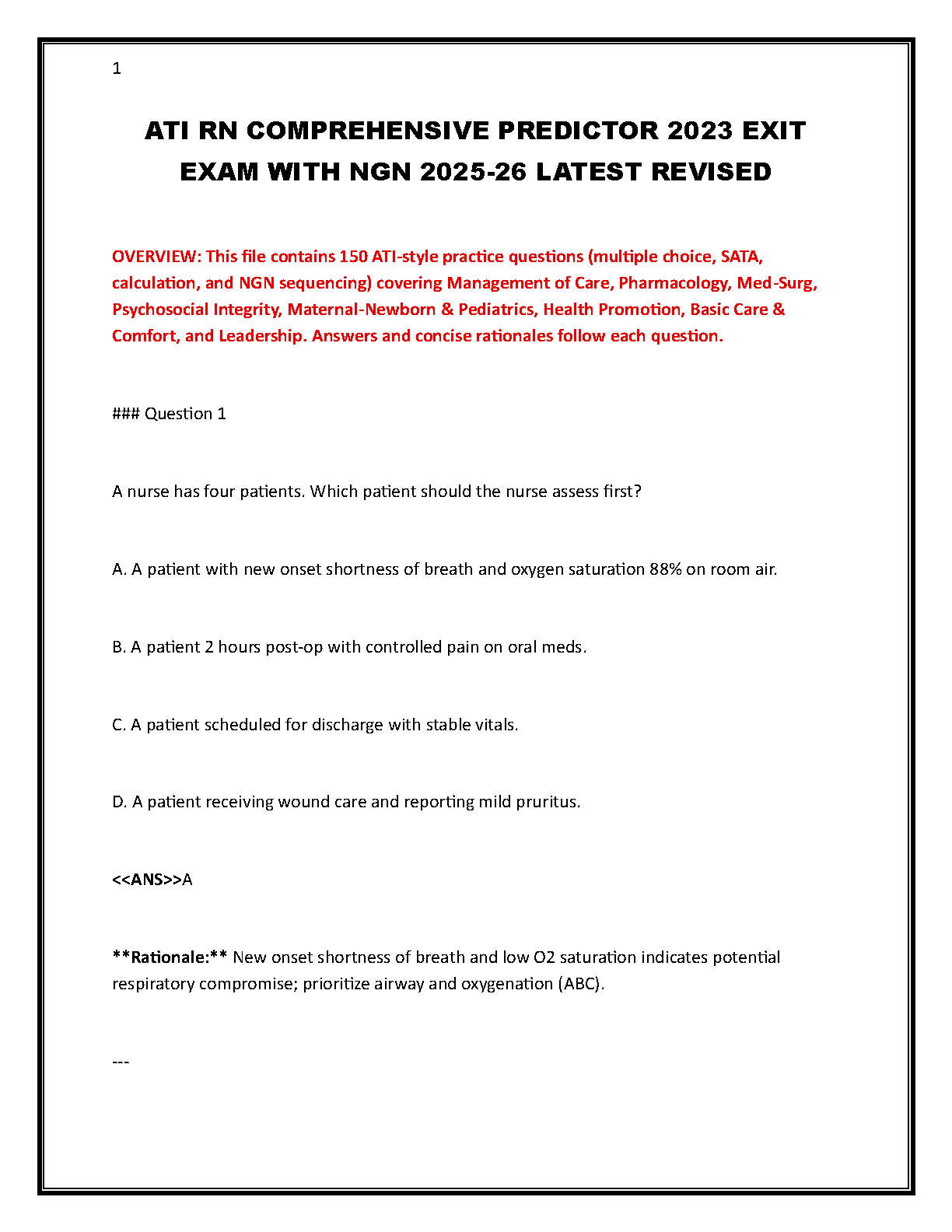 ATI RN Comprehensive Predictor Exit Exam 2023: Updated 2025-2026 NGN Edition | Test Bank with Questions and Rationales