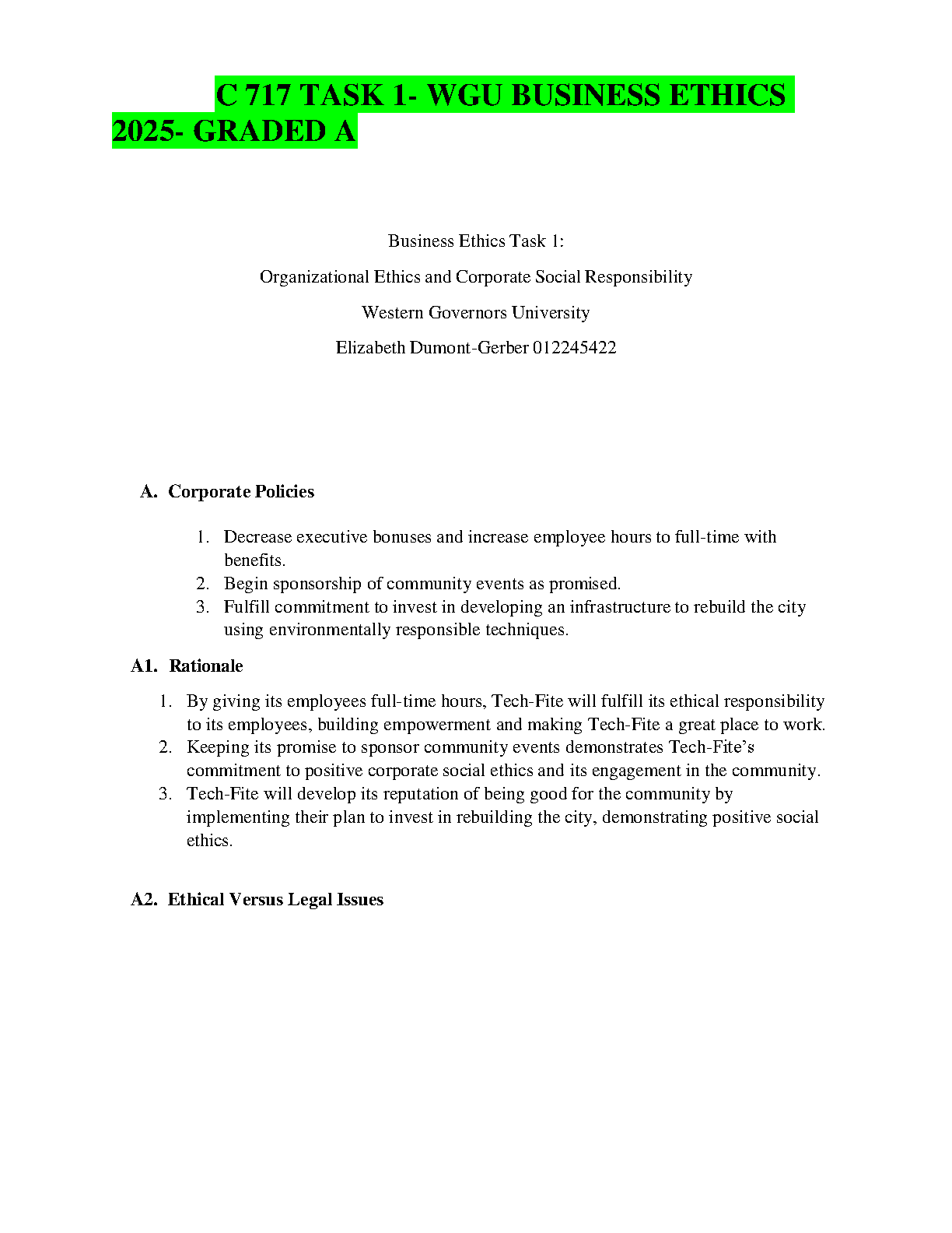 Achieve excellence in your WGU C717 Business Ethics course with this top-rated, Graded-A submission for Task 1. Updated for the 2025/2026 academic year, this guide provides a complete and well-structured answer to the prompt on Organizational Ethics and Corporate Social Responsibility. It covers the development of corporate policies, the rationale behind them, and the crucial differences between ethical and legal issues. Use this expertly crafted exemplar to understand the assignment's expectations, save time, and ensure you pass on your very first try.