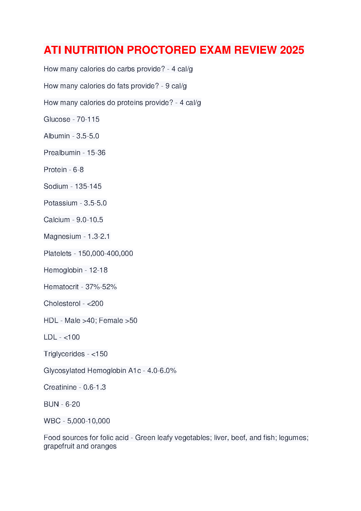 Struggling with the ATI Nutrition Proctored Exam? Your search ends here! This is the most up-to-date and comprehensive review guide for the 2025/2026 academic year. Dive deep into all the essential topics you need to master, including precise lab value ranges for Glucose, Albumin, Sodium, Potassium, Cholesterol, HgbA1c, and more. Quickly memorize the caloric values for carbohydrates, fats, and proteins, and learn key food sources for vital nutrients like folic acid. Our expertly compiled notes are designed to streamline your study process, boost your confidence, and help you pass the ATI Nutrition Proctored Exam on your very first attempt. Stop worrying about resits and secure your success today!