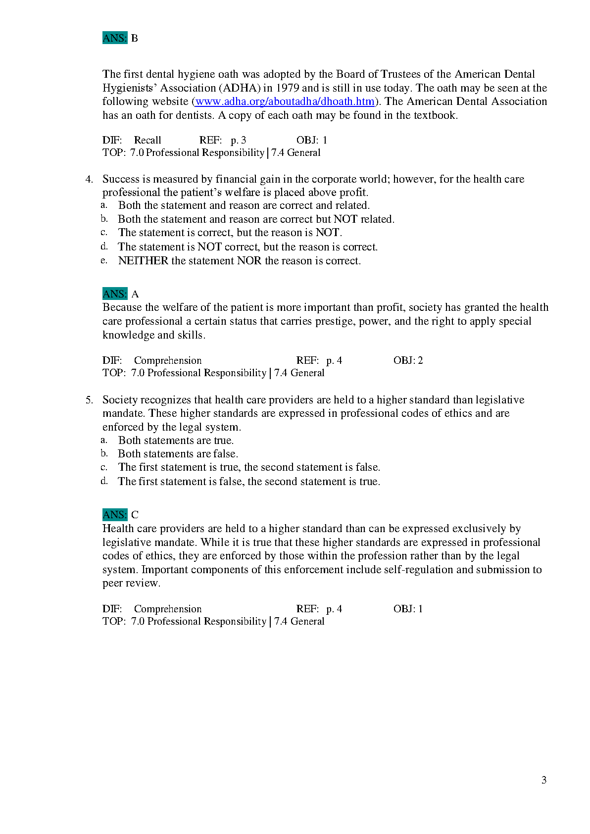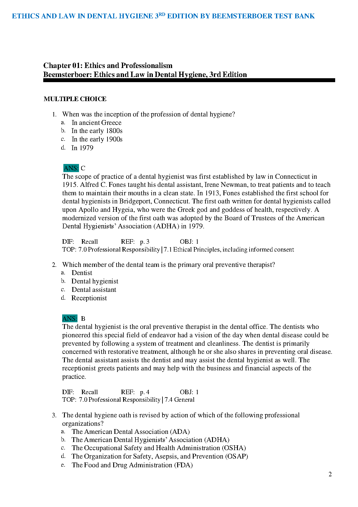 Test Bank for Ethics and Law in Dental Hygiene, 3rd Edition by Phyllis L. Beemsterboer