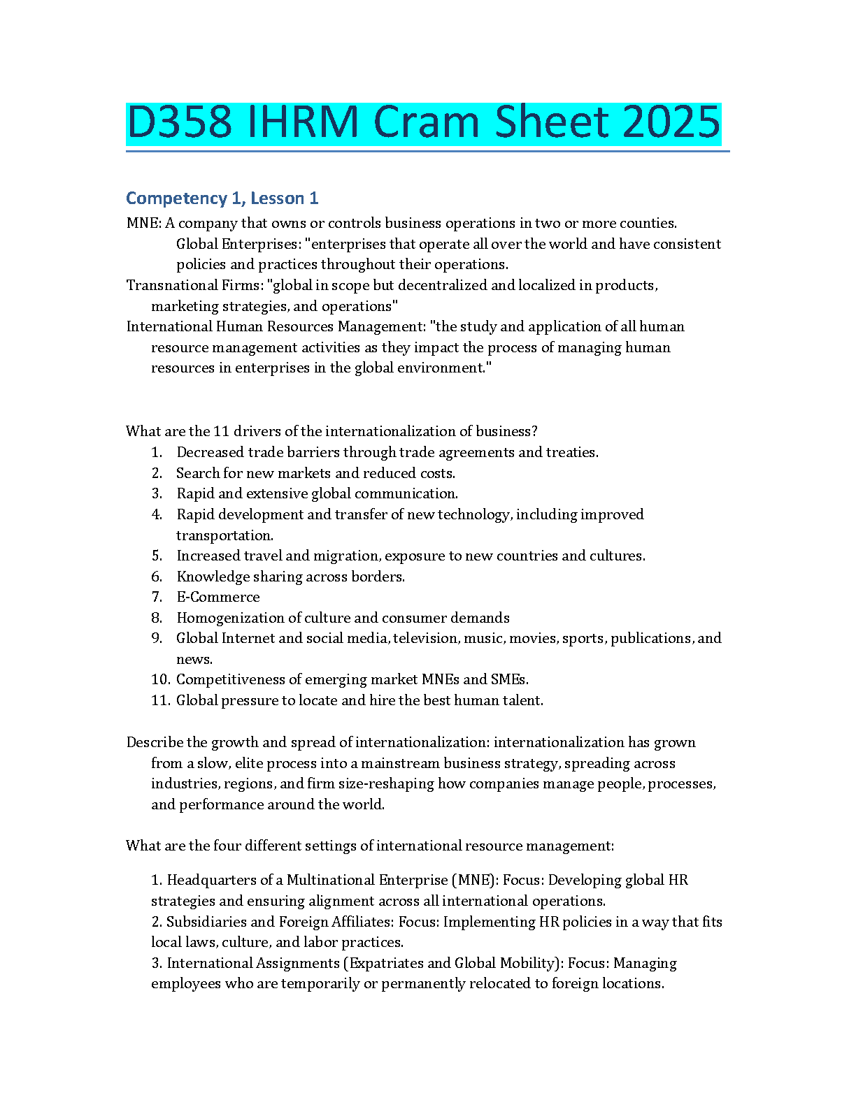 Get ready to master D358 International Human Resource Management with our newly updated Cram Sheet for the 2025/2026 academic year. This comprehensive study guide is expertly designed to help you pass your exam on the very first try and avoid costly resits. This resource covers all essential topics from Competency 1, including clear definitions of key concepts like Multinational Enterprises (MNEs) and Transnational Firms, a detailed breakdown of the 11 drivers of business internationalization, and the different settings of international resource management. Stop struggling and start studying smart with this essential, easy-to-follow guide to acing your D358 IHRM exam.
