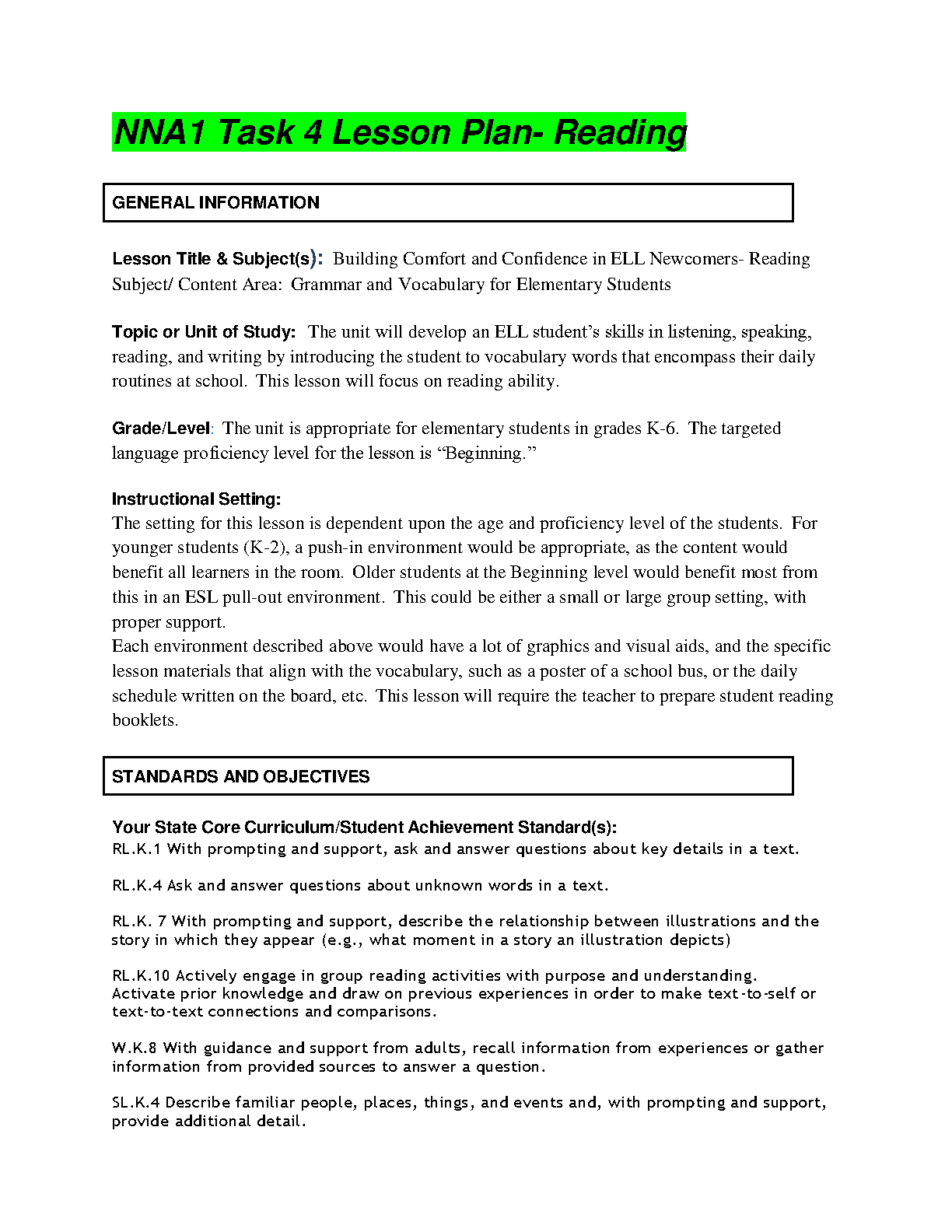 Struggling with WGU's NNA1 Task 4? This is a comprehensive, expertly crafted Reading Lesson Plan designed specifically to meet all the requirements for the NNA1 assessment. This plan focuses on 'Building Comfort and Confidence in ELL Newcomers' for elementary students (Grades K-6) at a beginning proficiency level. It covers essential grammar and vocabulary related to daily school routines, ensuring a well-rounded and effective lesson. Updated for the 2025/2026 academic year, this resource is your key to understanding the task requirements, saving you time, and helping you pass NNA1 on your very first attempt. Avoid resits and secure your A with this proven example!