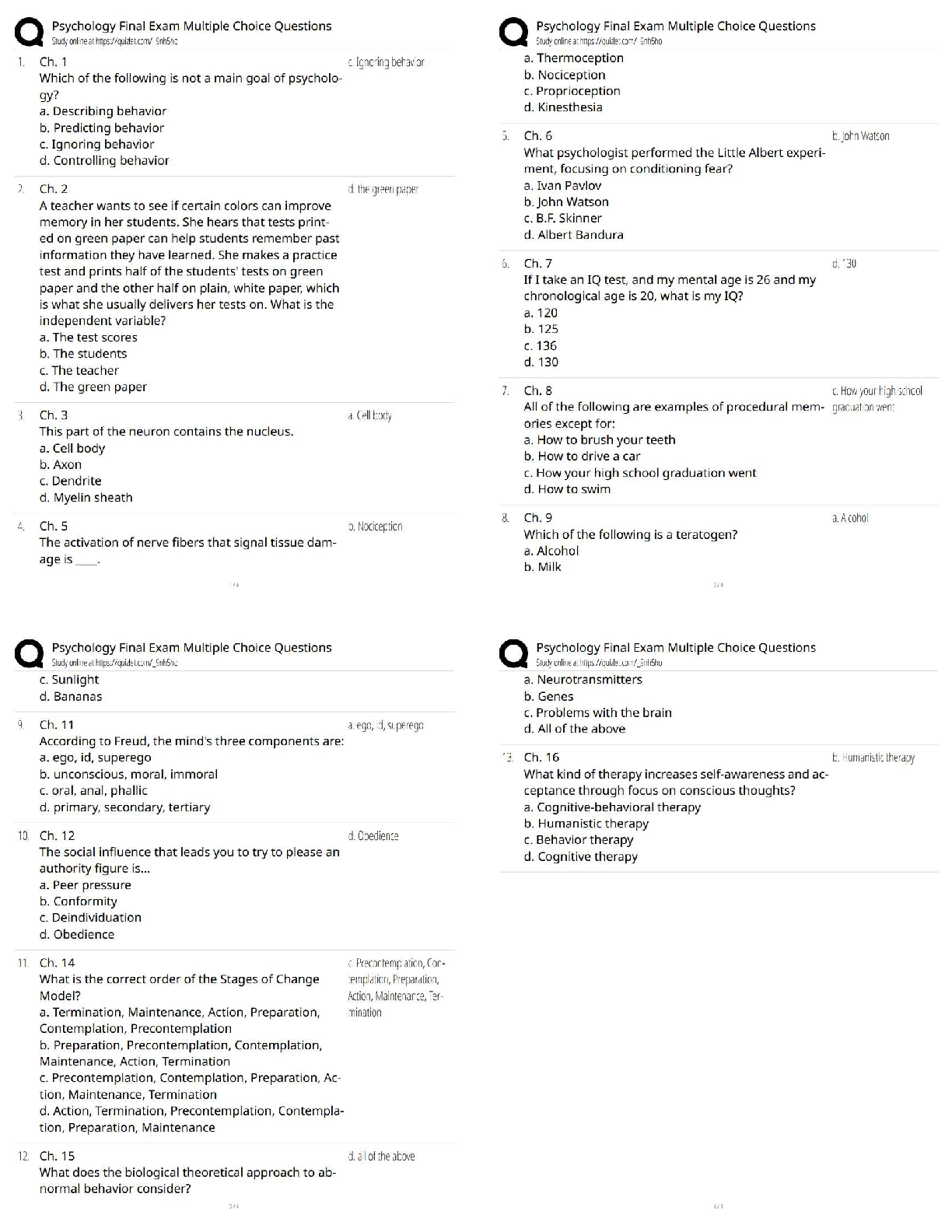 Master your introductory psychology course with this comprehensive Final Exam Test Bank for Psychology, 13th Edition by David G. Myers and C. Nathan DeWall. This indispensable study aid features a wide array of multiple-choice questions, each paired with a verified answer, covering critical topics from the entire textbook. Dive into key concepts including research methods, neuroscience, conditioning, memory, Freudian theory, and abnormal psychology. Perfect for self-assessment and targeted review, this test bank is your key to understanding the material deeply and excelling on your final exam. Download today and prepare for success!