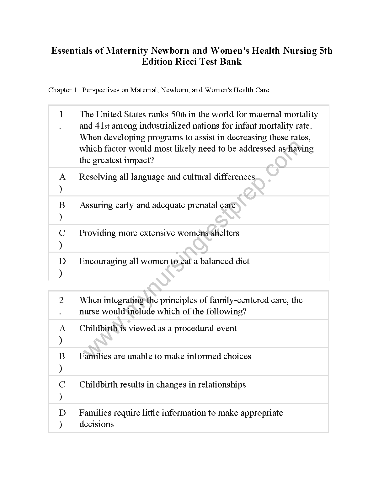 Achieve top grades in your nursing course with the official Test Bank for 'Essentials of Maternity Newborn and Women's Health Nursing, 5th Edition'. Authored by Ricci, Kyle, and Carman, this comprehensive resource is packed with a wide range of exam-style questions and detailed answers covering every chapter. It's the perfect study companion to test your understanding, reinforce key concepts, and prepare effectively for all your quizzes and exams, ensuring you excel in your studies.