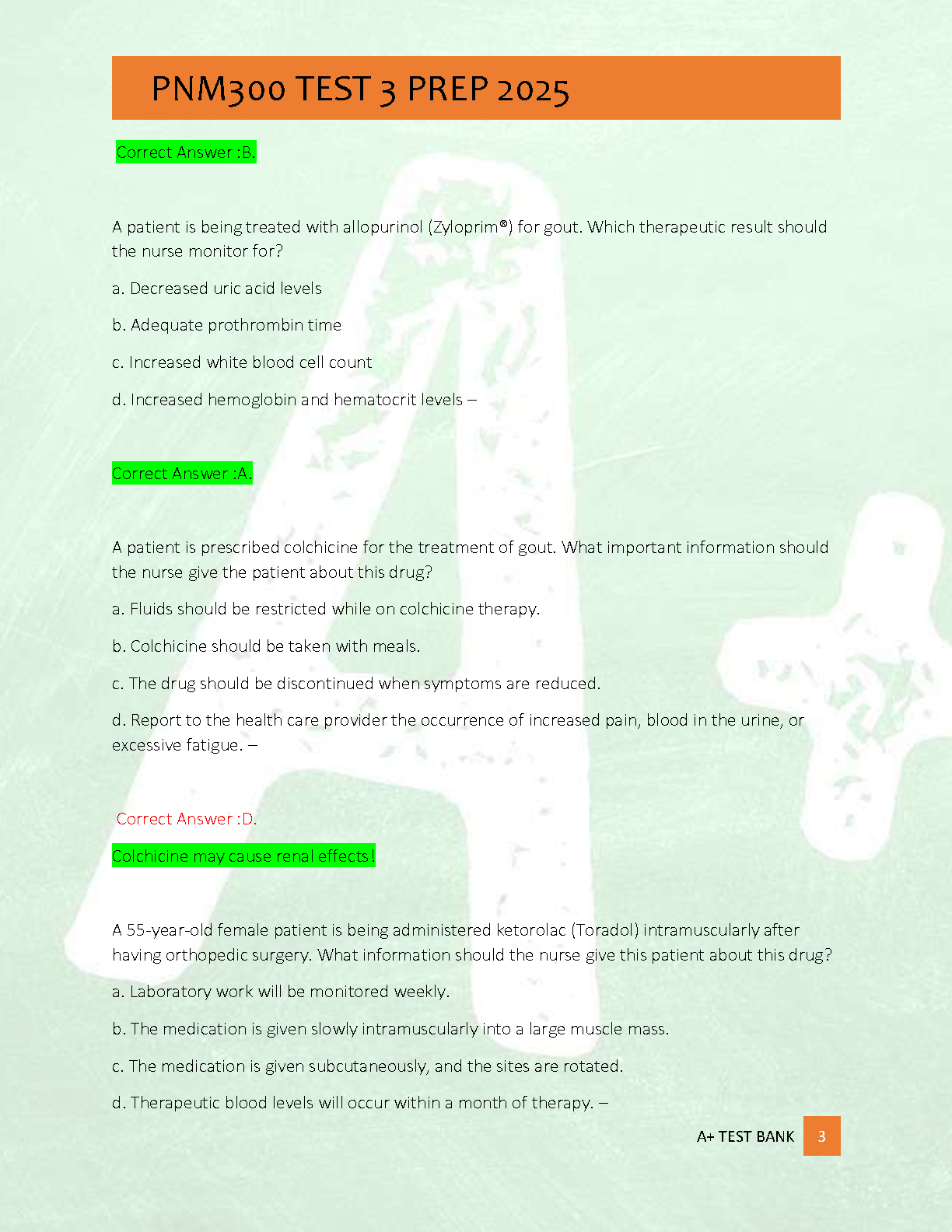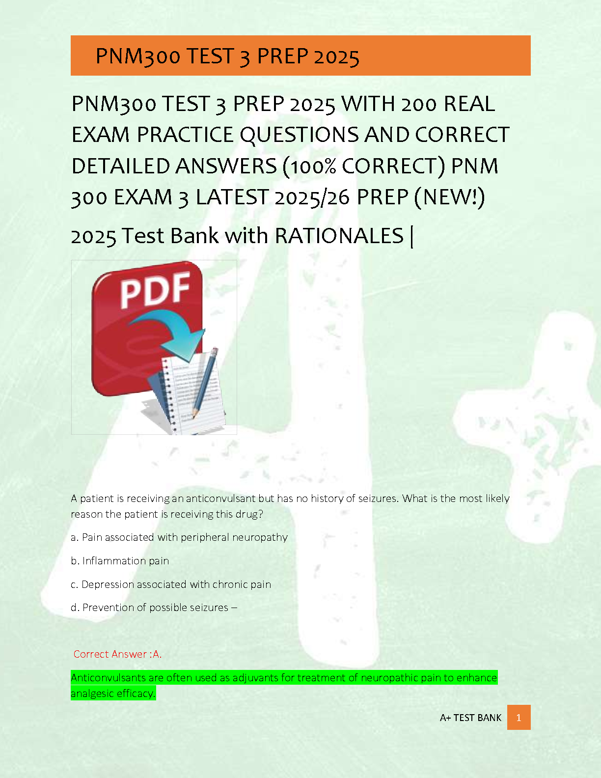 Unlock success in your PNM300 course with this essential Test 3 prep for the 2025/2026 academic year. This comprehensive test bank features over 200 meticulously crafted practice questions that mirror the actual exam format. Each question is accompanied by a verified correct answer and a detailed rationale, explaining the 'why' behind the solution. This resource is designed to deepen your understanding of key concepts, boost your confidence, and help you ace your exam on the first attempt.