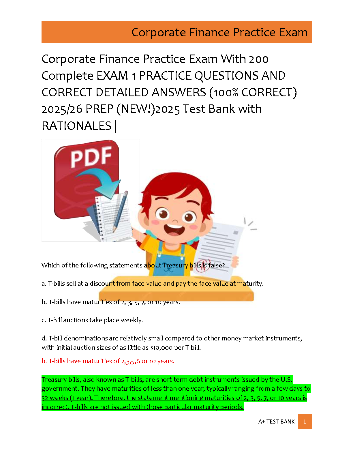 Corporate Finance, 13th Edition by Stephen Ross, Randolph Westerfield, Jeffrey Jaffe - Test Bank with 200 Exam 1 Practice Questions and Verified Answers with Rationales