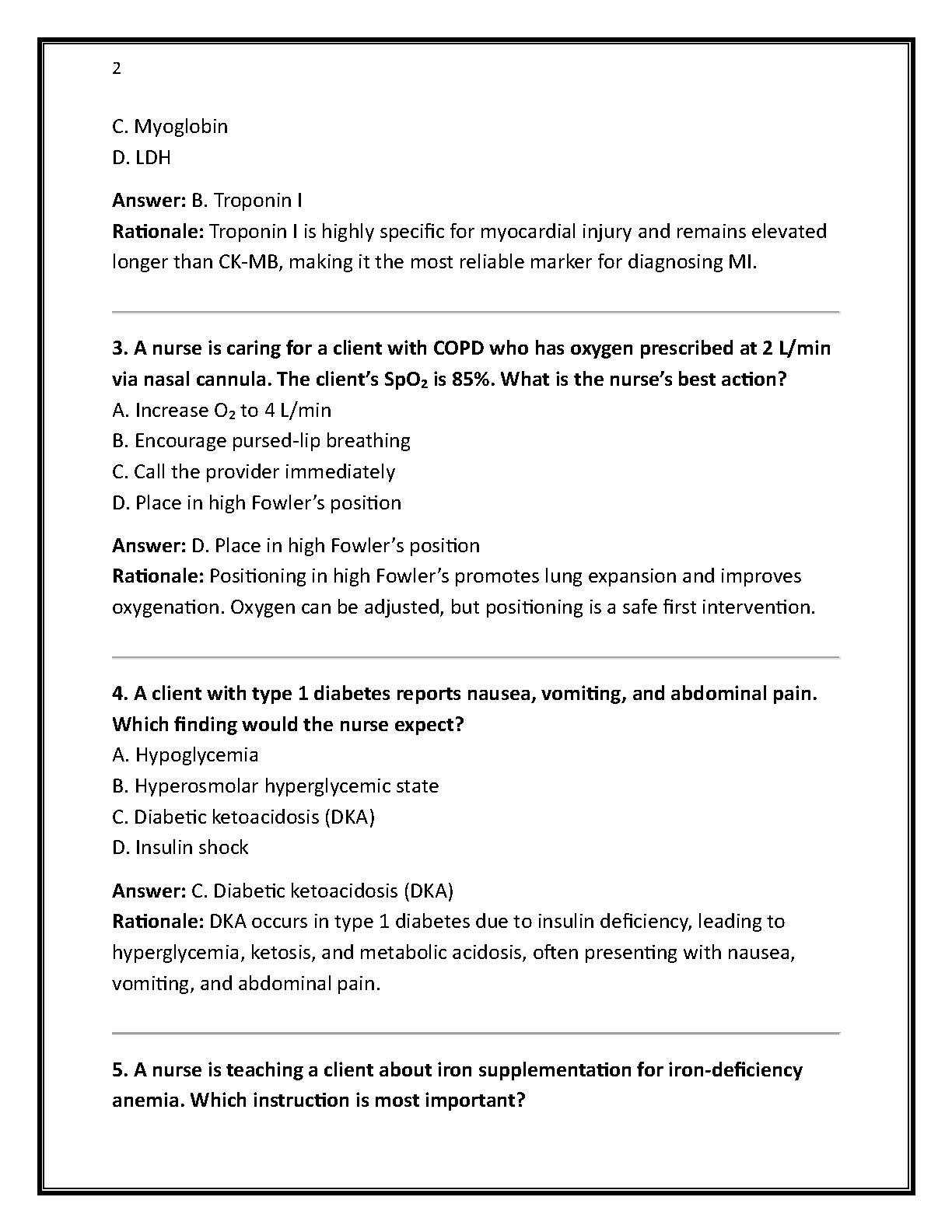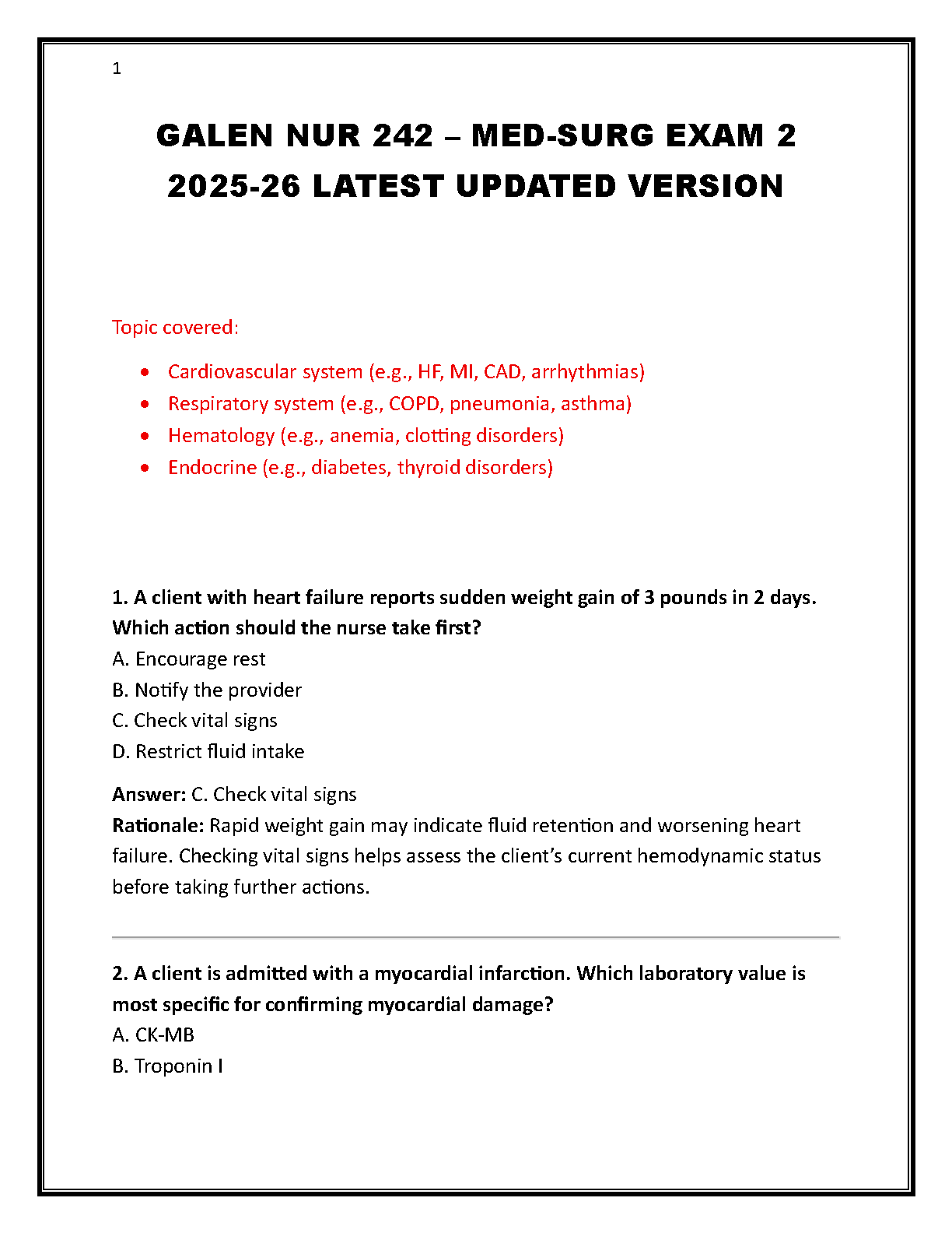 Prepare to ace your Galen College NUR 242 Med-Surg Exam 2 with this comprehensive and up-to-date test bank for the 2025-2026 academic year. This essential study guide is expertly designed to help you pass on your first attempt and avoid costly resits. It features a wide range of practice questions complete with detailed answers and rationales, covering all key topics including the Cardiovascular system (HF, MI, CAD), Respiratory system (COPD, pneumonia), Hematology (anemia, clotting disorders), and Endocrine system (diabetes, thyroid disorders). Master the material and walk into your exam with confidence!