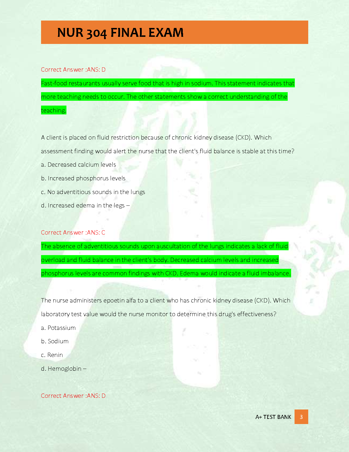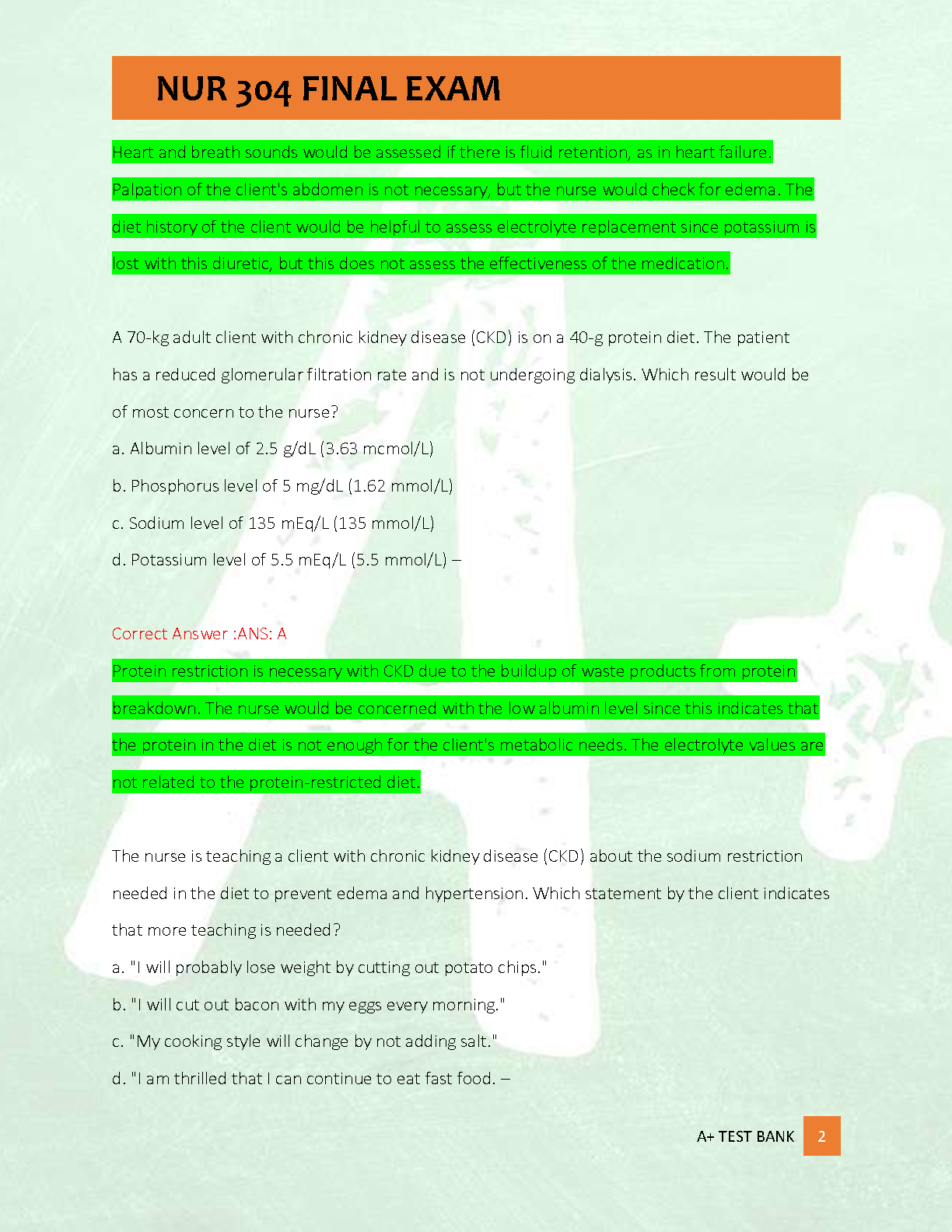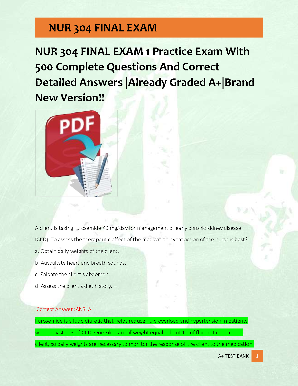 Excel in your NUR 304 course with our latest 2025/2026 Final Exam Test Bank. This essential study resource provides 500 meticulously crafted practice questions, each complete with correct, detailed answers and rationales. Designed to mirror the actual exam format, this A+ graded material covers all critical topics, ensuring you are fully prepared. Boost your confidence, master complex concepts, and secure the grade you deserve. Download now and take the first step towards passing your final exam with flying colors on your first attempt!