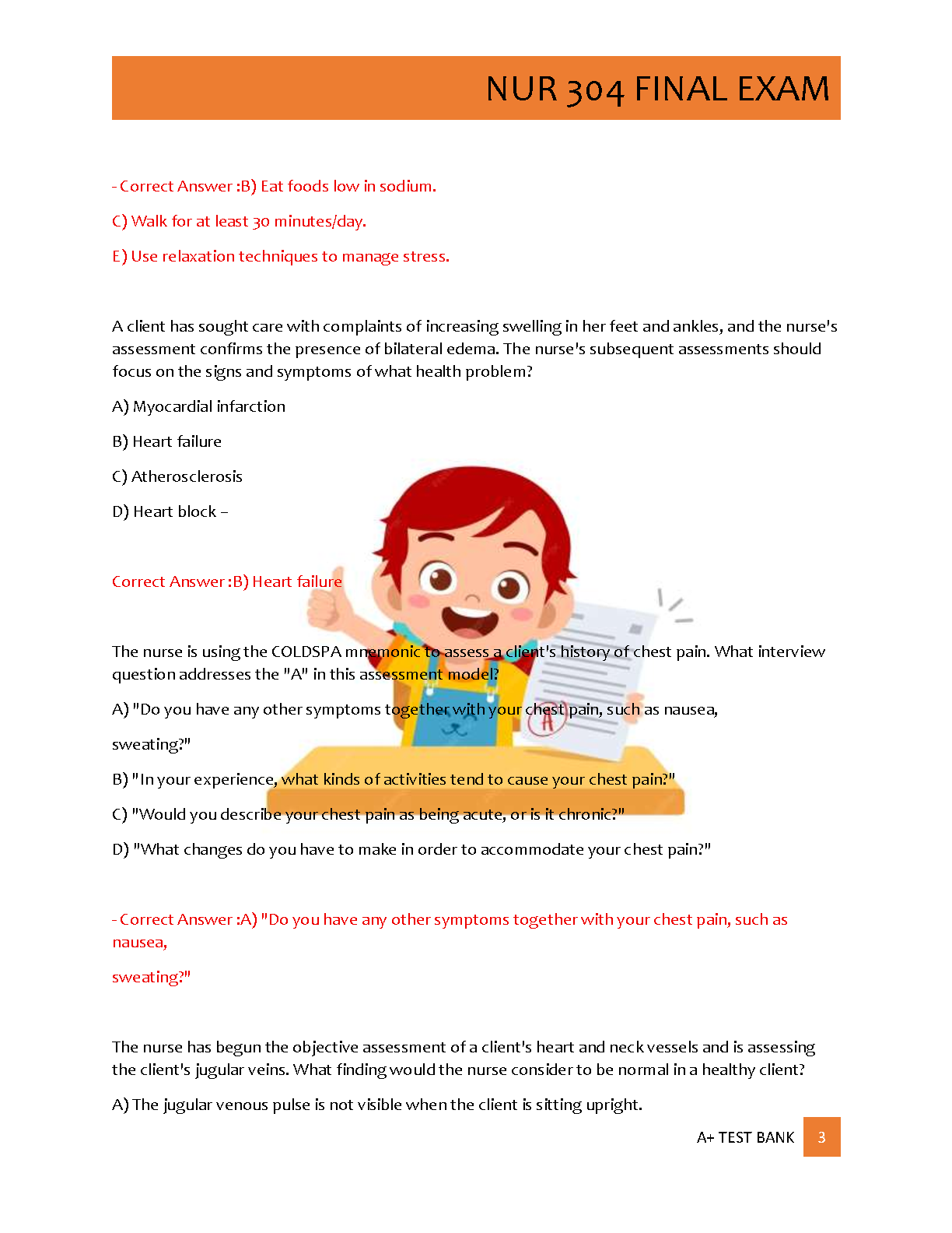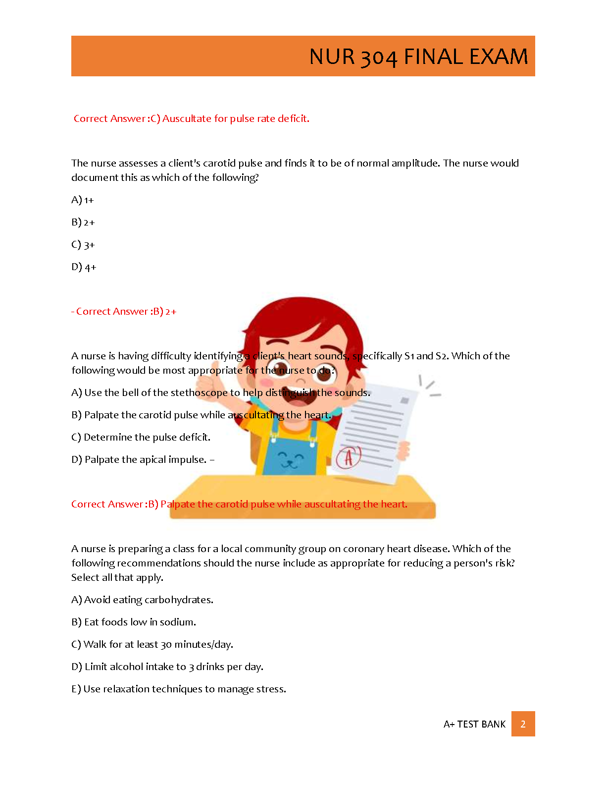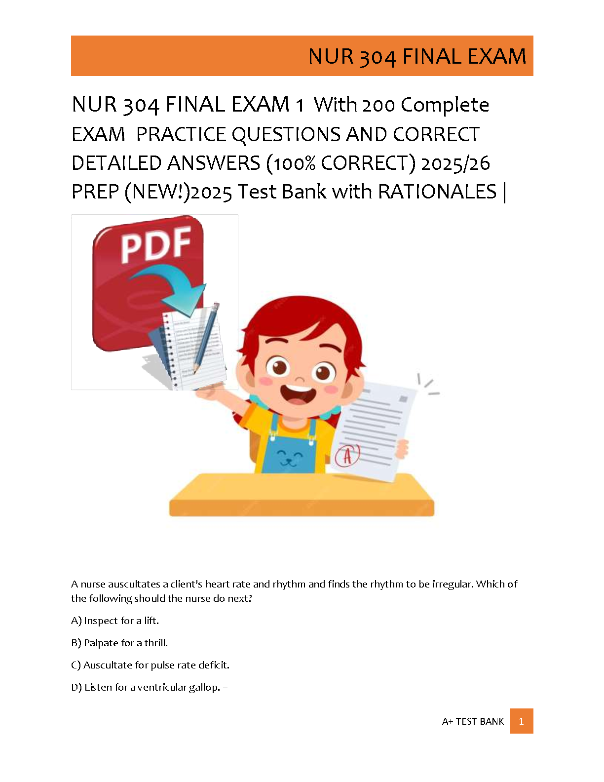 Get ready to ace your NUR 304 Final Exam with our latest 2025/2026 Test Bank. This comprehensive resource includes 200 expertly crafted practice questions covering all key topics. Each question comes with a 100% correct, verified answer and a detailed rationale to help you understand the core concepts, not just memorize facts. This A+ guide is designed to boost your confidence, enhance your critical thinking, and ensure you're fully prepared for success on your final exam. Download now and take the first step towards mastering NUR 304.