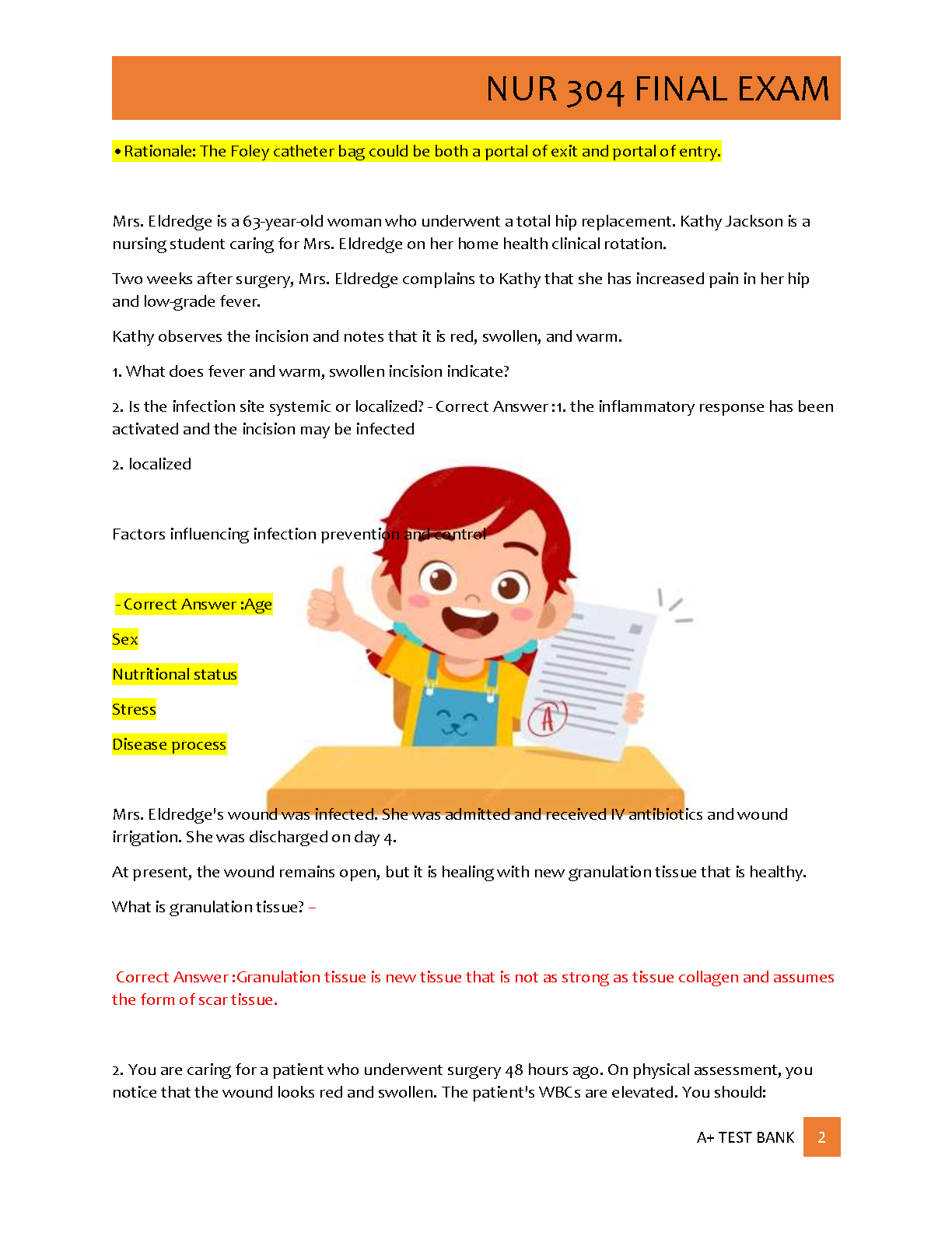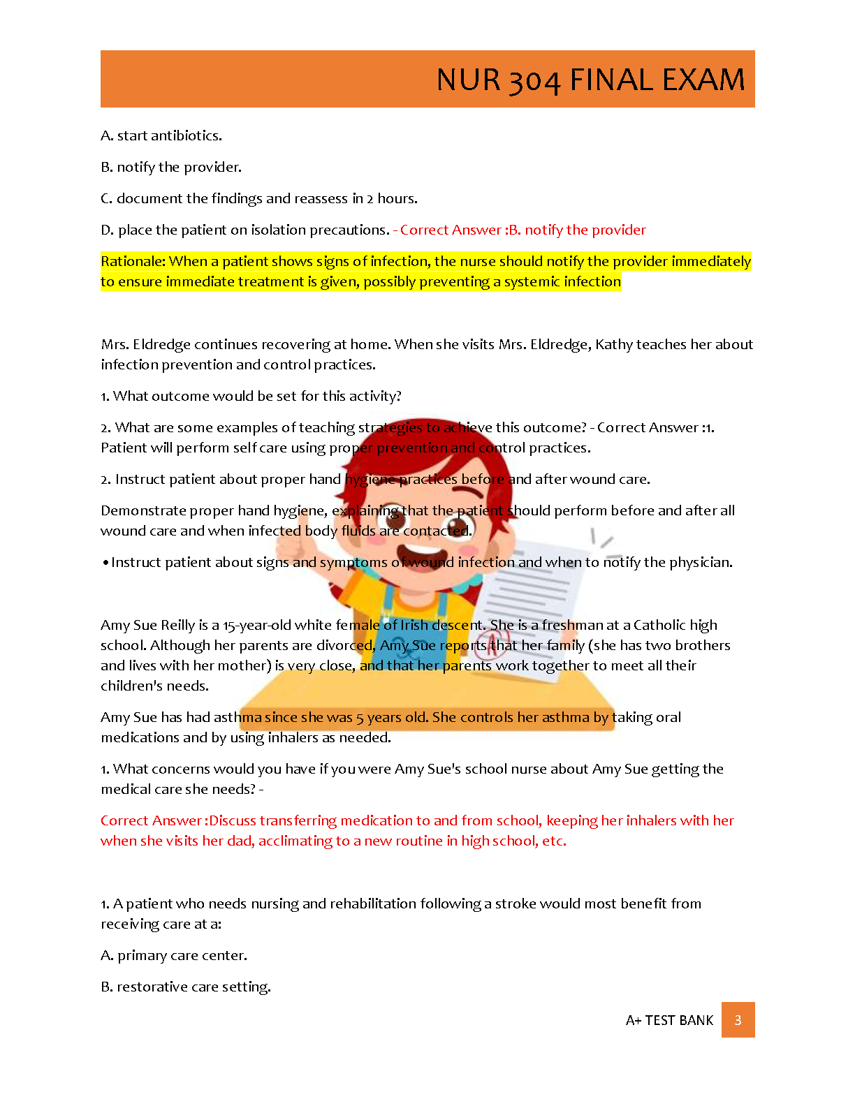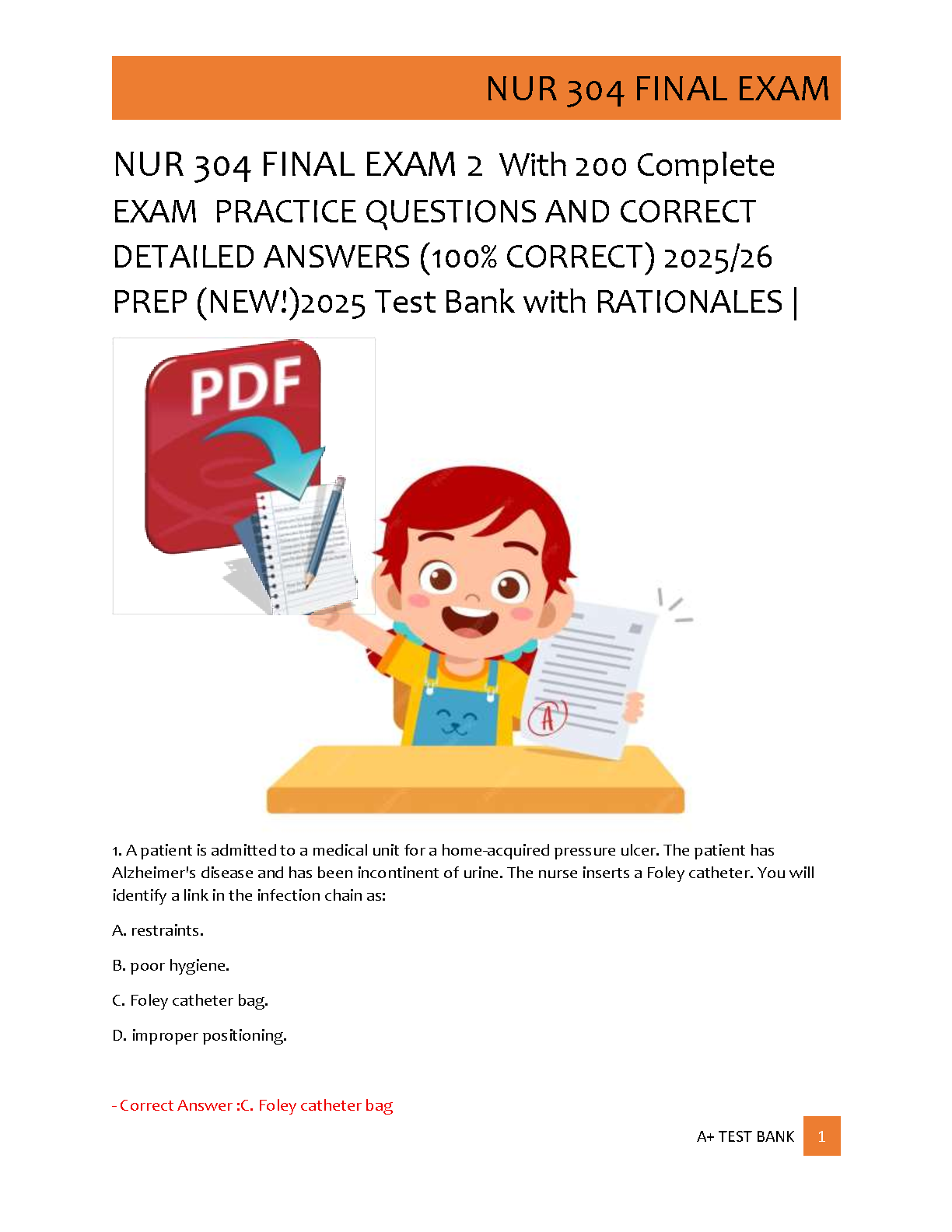 Elevate your study strategy and guarantee success on your NUR 304 final exam with our latest 2025/2026 Test Bank. This comprehensive resource includes 200 meticulously crafted practice questions that mirror the actual exam format. Each question comes with a 100% correct, verified answer and a detailed rationale to deepen your understanding of key nursing concepts. This is the ultimate tool to help you master the material and pass your exam with confidence on the first try. Download now for instant access!