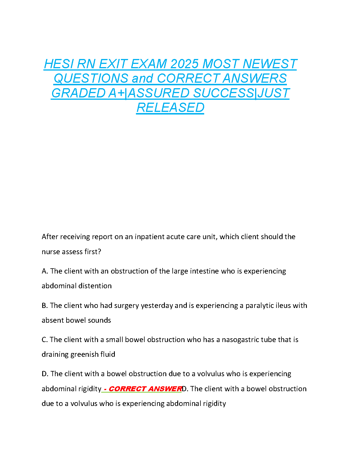 Ace your nursing school finals with the ultimate study guide for the HESI RN Exit Exam 2025. This comprehensive test bank is meticulously compiled with the most current questions and 100% correct, verified answers. Designed to mirror the actual exam format, this resource is your key to achieving an A+ grade and passing on your first attempt. Stop stressing and start studying smart with this just-released guide for assured success in your nursing career.