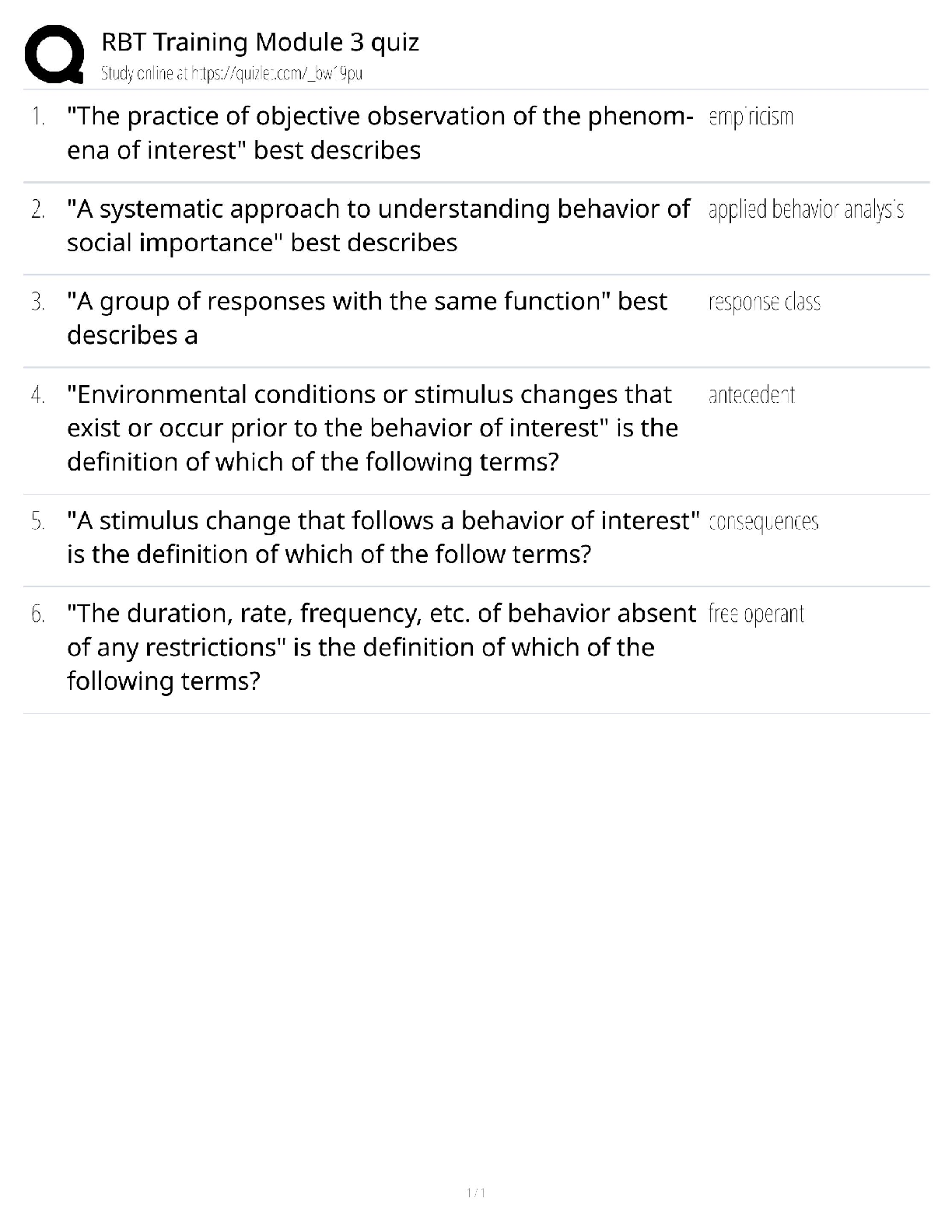 Master the fundamental concepts of Applied Behavior Analysis with our comprehensive test bank for the RBT Training Module 3. This expertly curated resource provides a full set of practice questions and verified answers, covering key topics such as empiricism, antecedents, consequences, response classes, and the core principles of ABA. Designed for the 2025/2026 academic year, this study guide is your ultimate tool to ace the Module 3 quiz and build a strong foundation for the RBT certification exam. Pass on your first try and avoid resits by thoroughly preparing with these targeted questions.