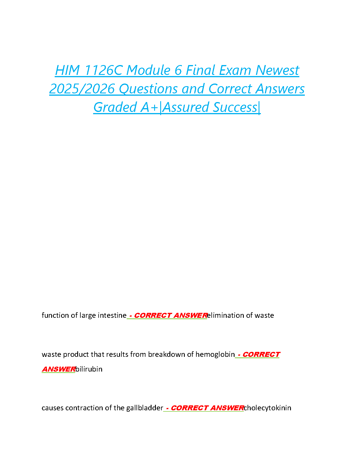 Master the HIM 1126C Module 6 Final Exam with our comprehensive test bank, updated for the 2025/2026 academic year. This resource provides a complete set of questions with 100% correct, verified answers, ensuring you are fully prepared to ace your exam and achieve an A+ grade. Designed to guarantee success on your first try, this study guide covers all essential topics, helping you understand key concepts and avoid resits. Get instant access and start studying smart for assured success!