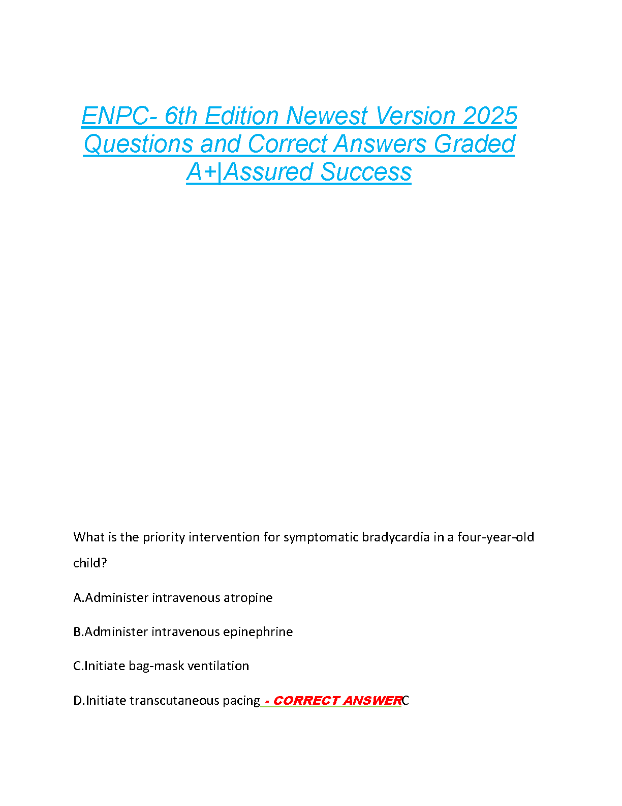 Get ready to ace your Emergency Nursing Pediatric Course certification with our latest test bank for the ENPC 6th Edition. This comprehensive resource, updated for the 2025/2026 testing cycle, is meticulously crafted to align with the official ENA curriculum. It features an extensive collection of exam-style questions, each with a verified correct answer, to ensure you are fully prepared. Don't just study—master the material and walk into your exam with the confidence to pass on your first attempt, avoiding costly and stressful resits. Achieve an A+ grade and advance your career with this essential study tool.