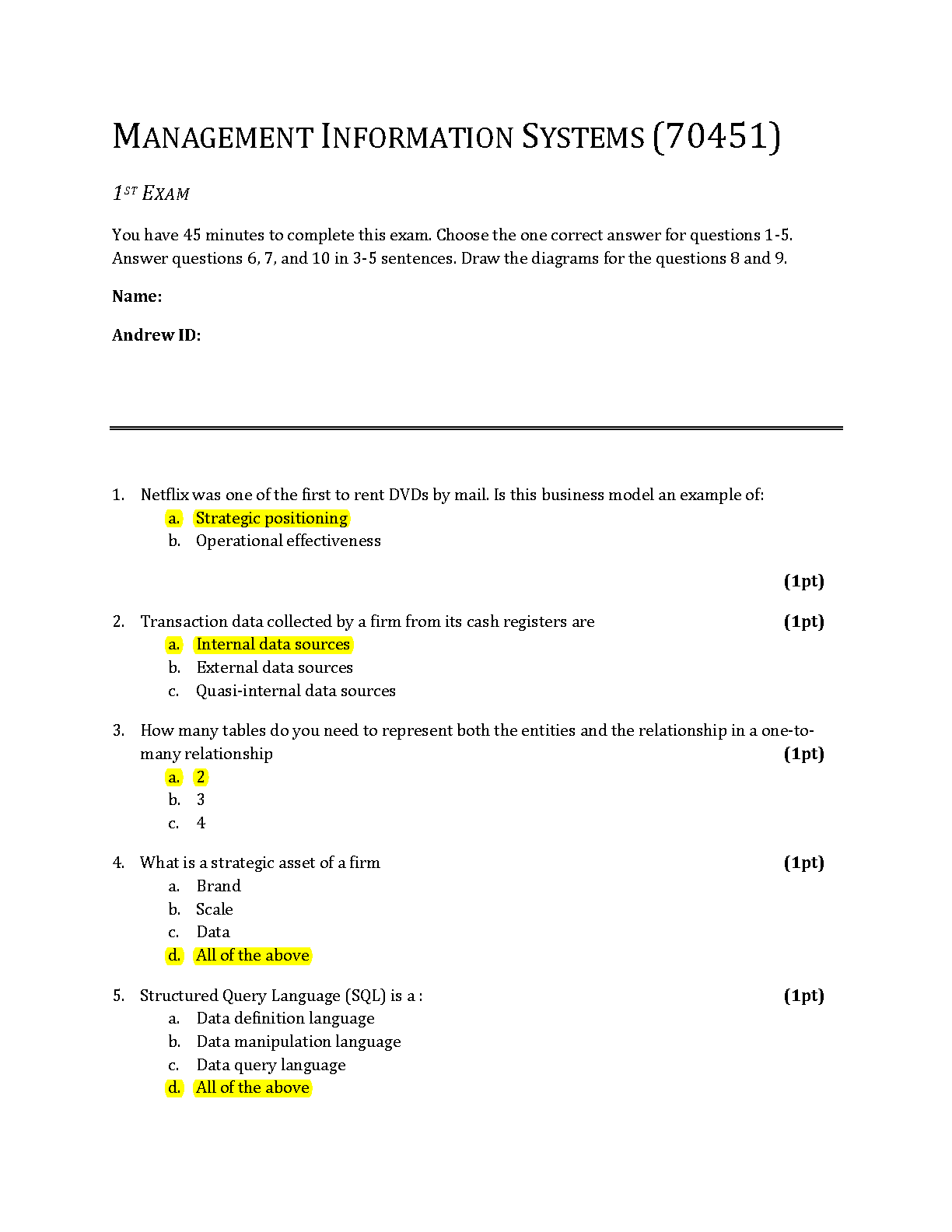 Unlock success in your Management Information Systems (70451) course with this comprehensive test bank for the 17th Edition of the renowned textbook by Laudon and Laudon. This resource features a complete 1st exam with verified, highlighted answers, covering crucial topics such as strategic positioning, internal data sources, database relationships, strategic assets, and the fundamentals of Structured Query Language (SQL). Prepare effectively, understand key concepts, and ace your exams with confidence using these targeted practice questions and solutions.