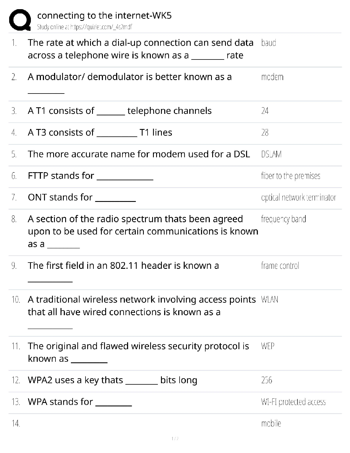 Ace your networking exams with this comprehensive test bank focused on 'Connecting to the Internet'. This downloadable resource provides a complete set of questions and 100% correct, verified answers covering crucial topics like data rates, modems, T1/T3 lines, DSLAM, Fiber to the Premises (FTTP), and essential wireless security protocols such as WEP, WPA, and WPA2. Ideal for students seeking to master fundamental networking concepts and excel in their coursework.