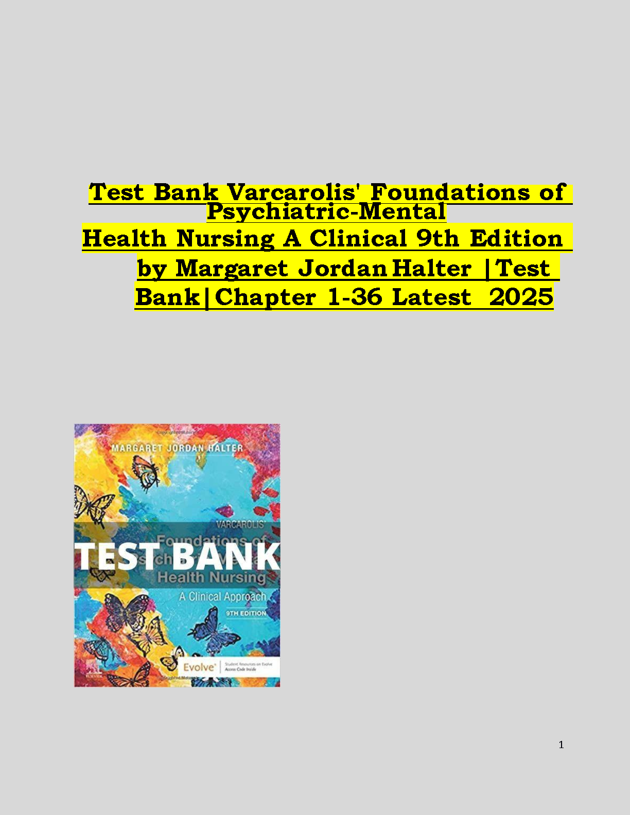 Master your psychiatric nursing course with the complete Test Bank for Varcarolis' Foundations of Psychiatric-Mental Health Nursing: A Clinical Approach, 9th Edition. Authored by Margaret Jordan Halter, this essential study resource provides comprehensive coverage of all 36 chapters. It features a vast collection of exam-style questions with detailed answers and rationales, specifically designed to help you grasp key concepts, reinforce your learning, and excel on your exams. This is the ultimate tool for nursing students aiming to achieve top grades and build a strong foundation in psychiatric-mental health care.