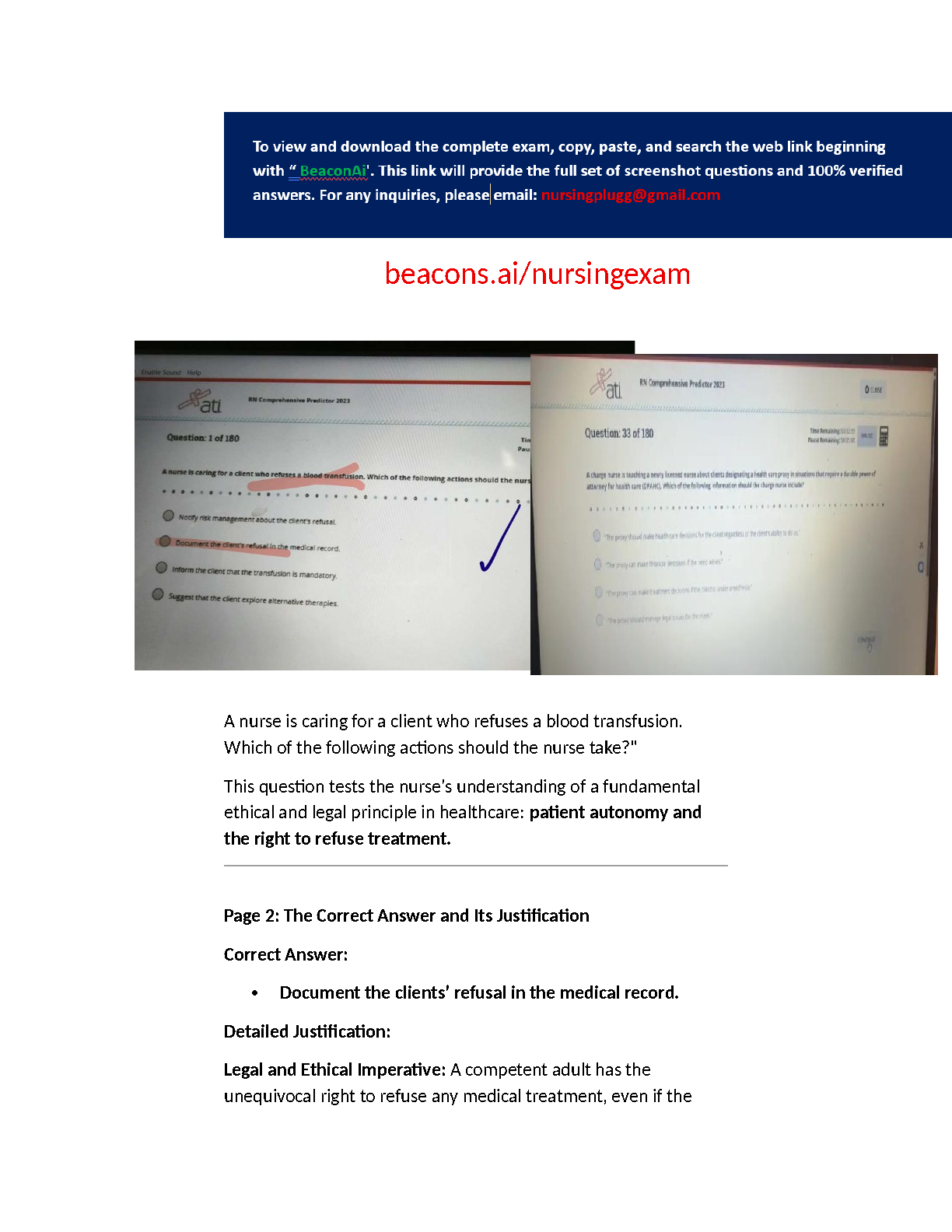 Unlock your full potential and excel in your nursing career with our comprehensive Test Bank for the ATI RN Comprehensive Predictor 2023. This essential study resource contains a full set of 180 verified questions, each complete with in-depth answers and detailed rationales. Designed to mirror the actual exam format, this guide helps you master complex concepts, understand the reasoning behind correct answers, and build the confidence needed to pass on your first attempt. It's the ultimate tool for nursing students preparing for this critical step towards NCLEX success.
