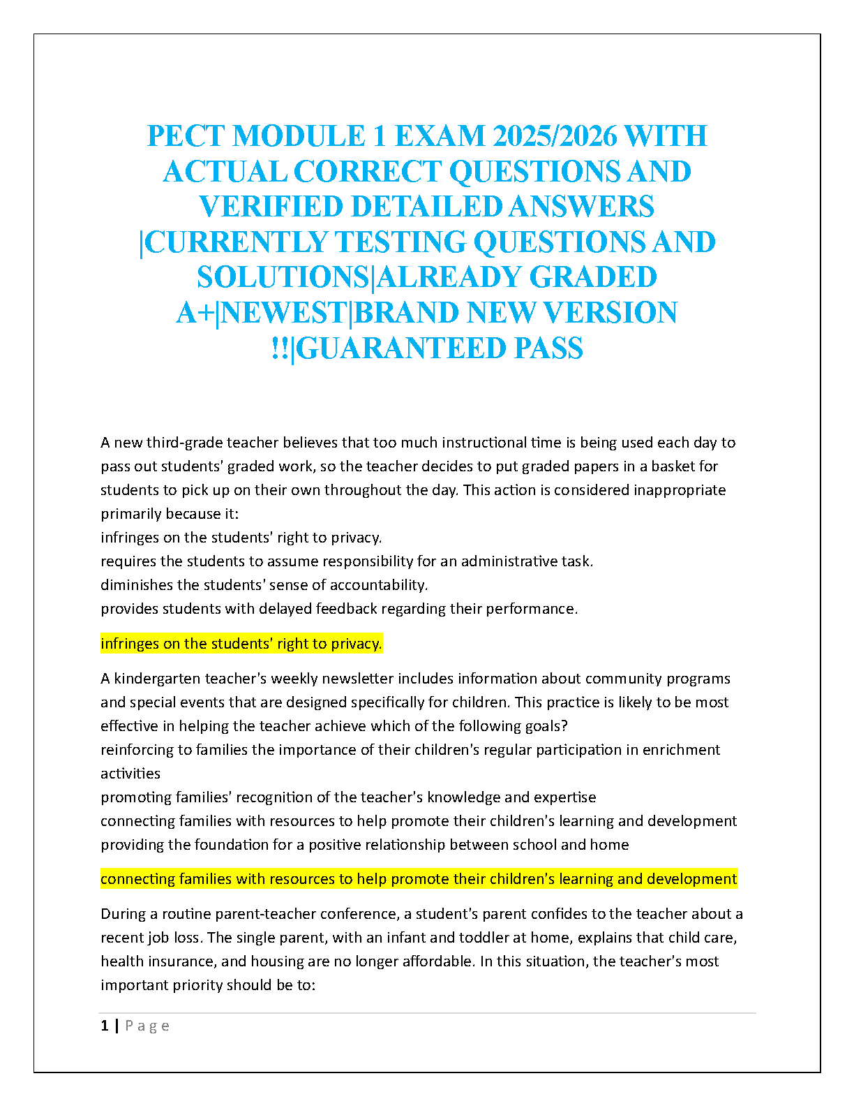 Prepare to ace your Pennsylvania Educator Certification Tests (PECT) with our premium Test Bank for Module 1, fully updated for 2025/2026. This study resource provides a comprehensive collection of current, exam-style questions paired with expertly verified, detailed answers. Our guide is meticulously compiled to reflect the actual test, ensuring you study the most relevant material. Master the concepts, build confidence, and secure a guaranteed pass on your first try. Get instant access to the ultimate tool for PECT success and begin your journey to certification today.